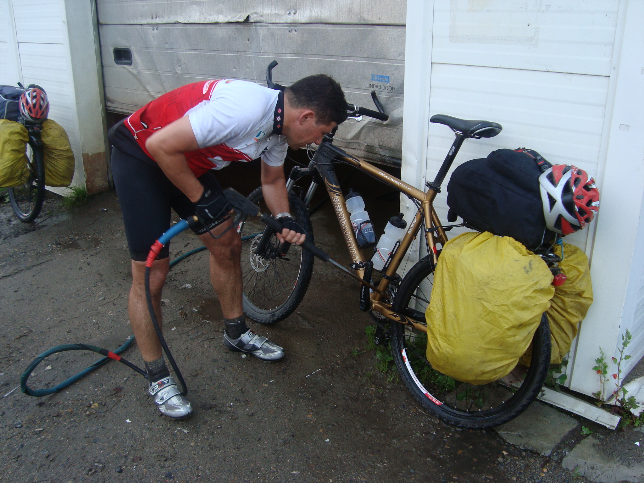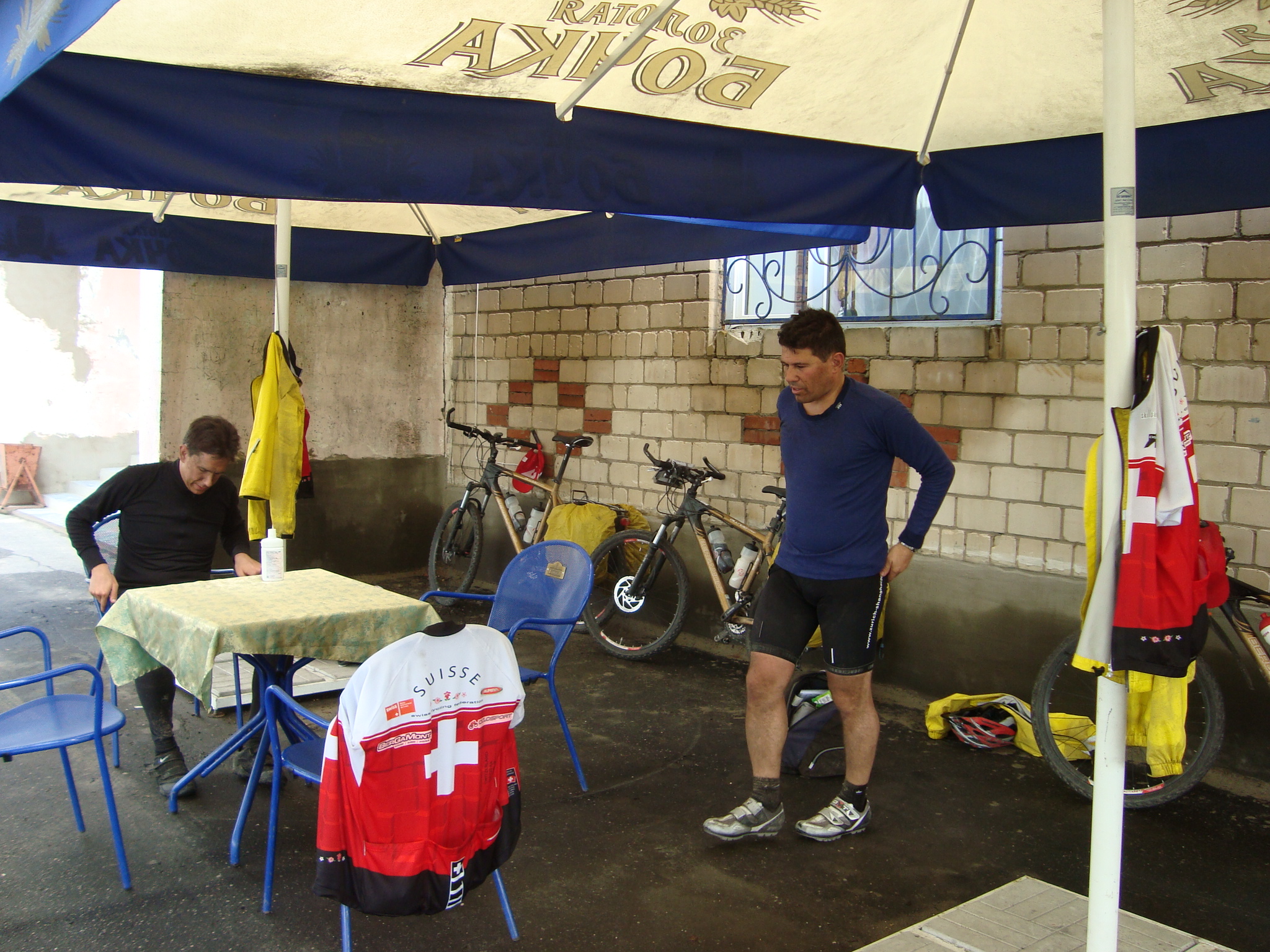 Nach dem Mittagsrast lachte uns dann die Sonne an und wir konnten die zweiten 120 Km trocken in Angriff nehmen. Sie waren einiges ereignisreicher als die Ersten. Zuerst schlug der Defektteufel zweimal zu. Es traf Matt und etwas später Beat mit einem Plattfuss. Dank dem Einsatz von Chefmechaniker Grazi waren die Defekte schnell behoben.