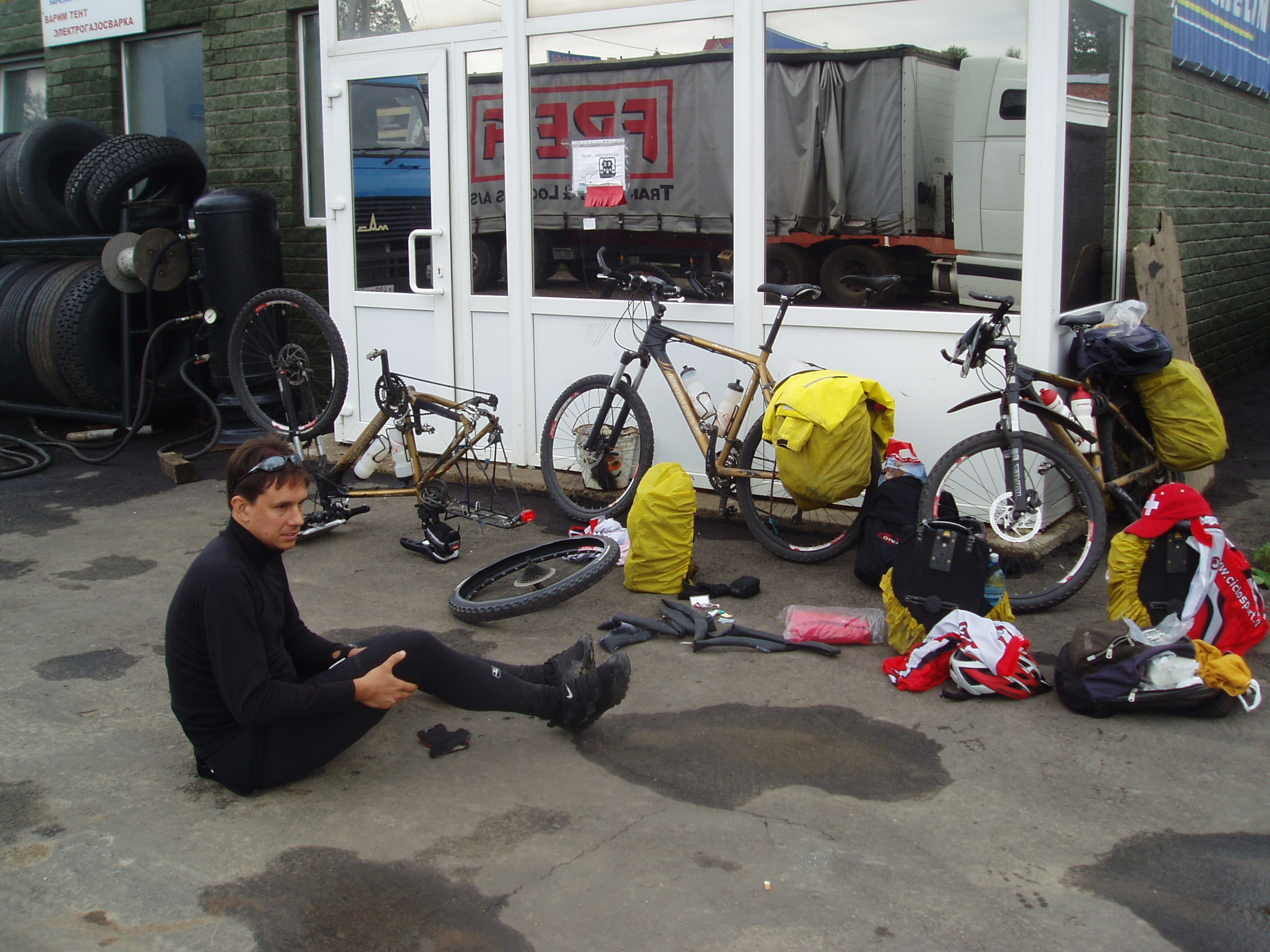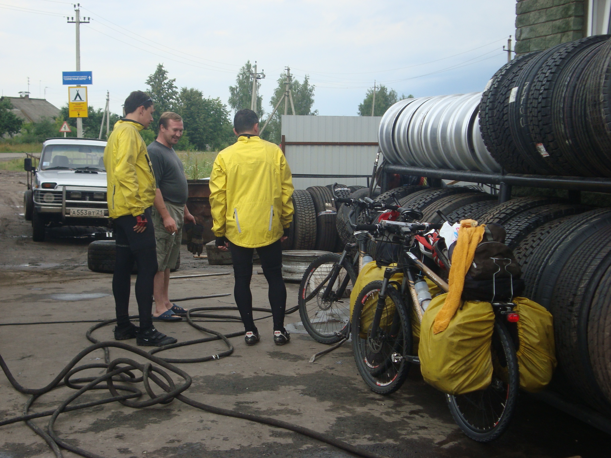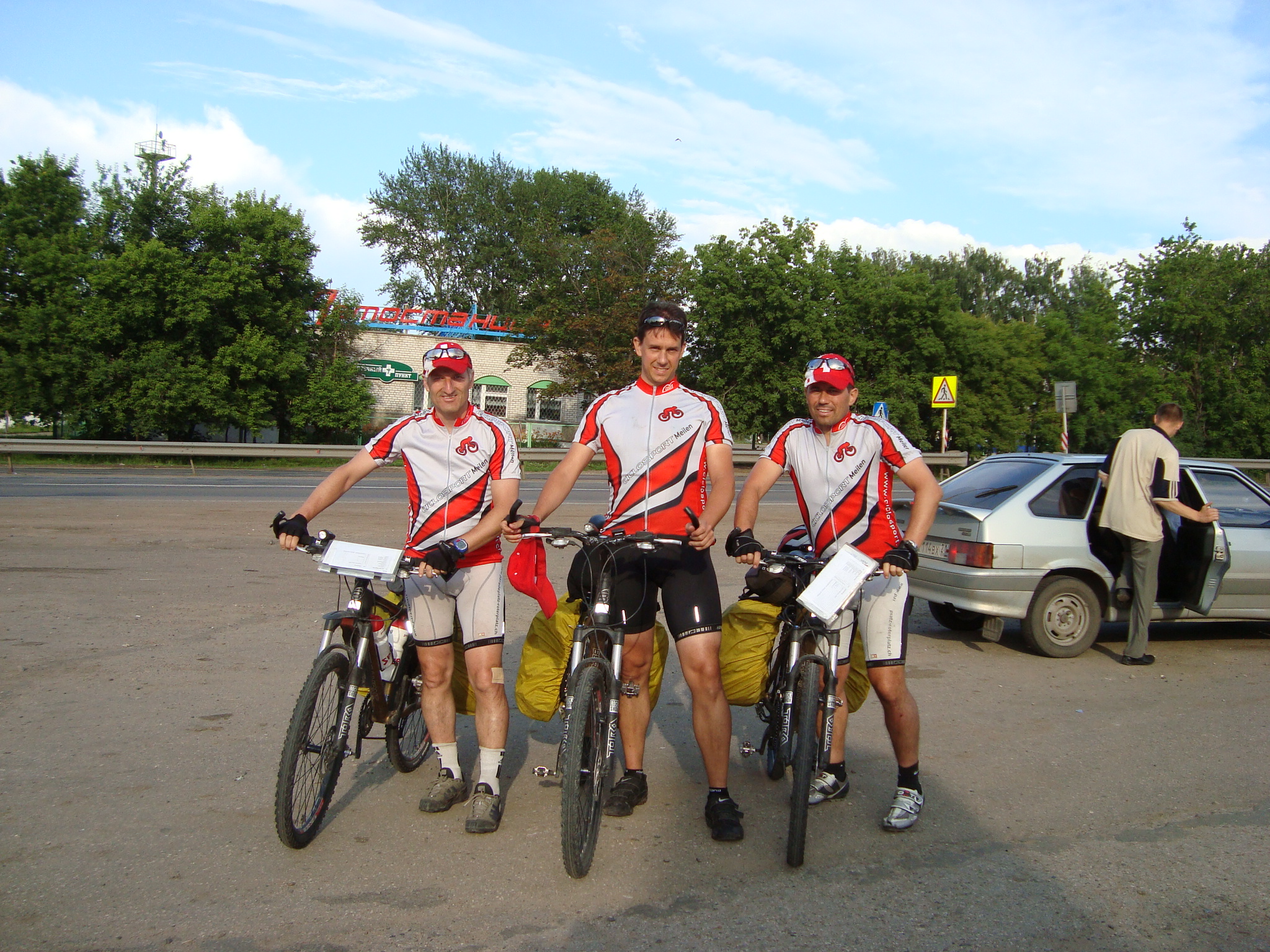 Einen kurzen Moment waren wir ratlos und der Gedanke mit einem Lastwagen nach Kazan zu fahren geisterte durch unsere Köpfe. Dann entschied die Tourleitung ins nahe gelegene Ceboksary zu fahren und neue Schläuche zu suchen. Beat und Matt machten sich mit dem Bus auf den Weg, während Graziano beim Material blieb. 2 Std. später waren wir dank der Hilfe von Einheimschen mit 5 top Schläuchen wieder zurück.
