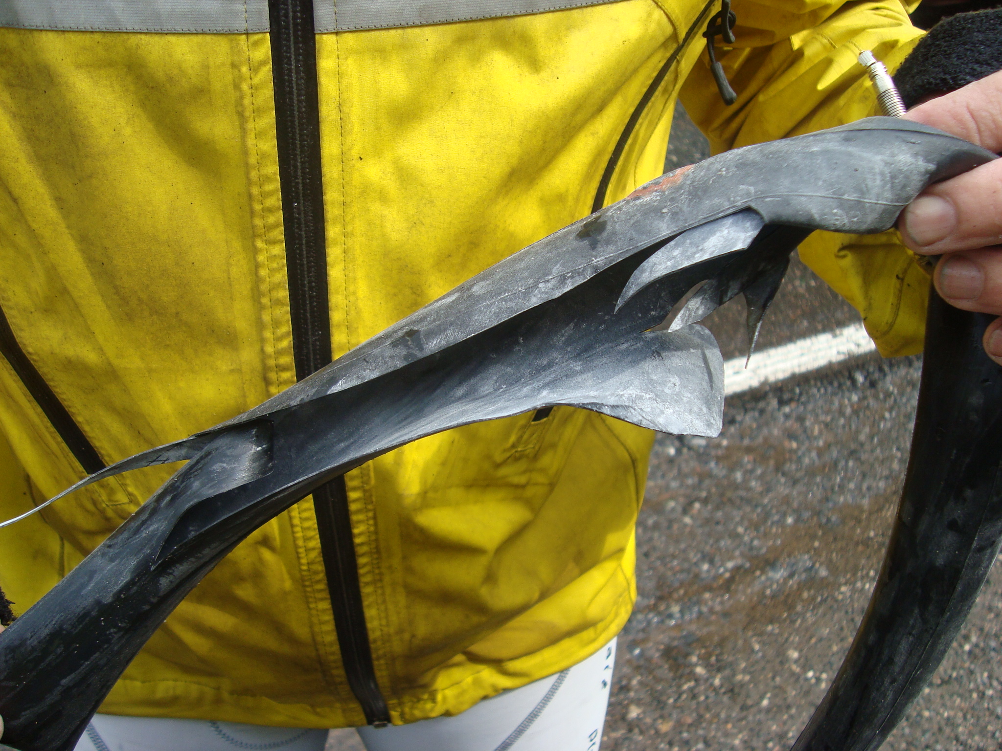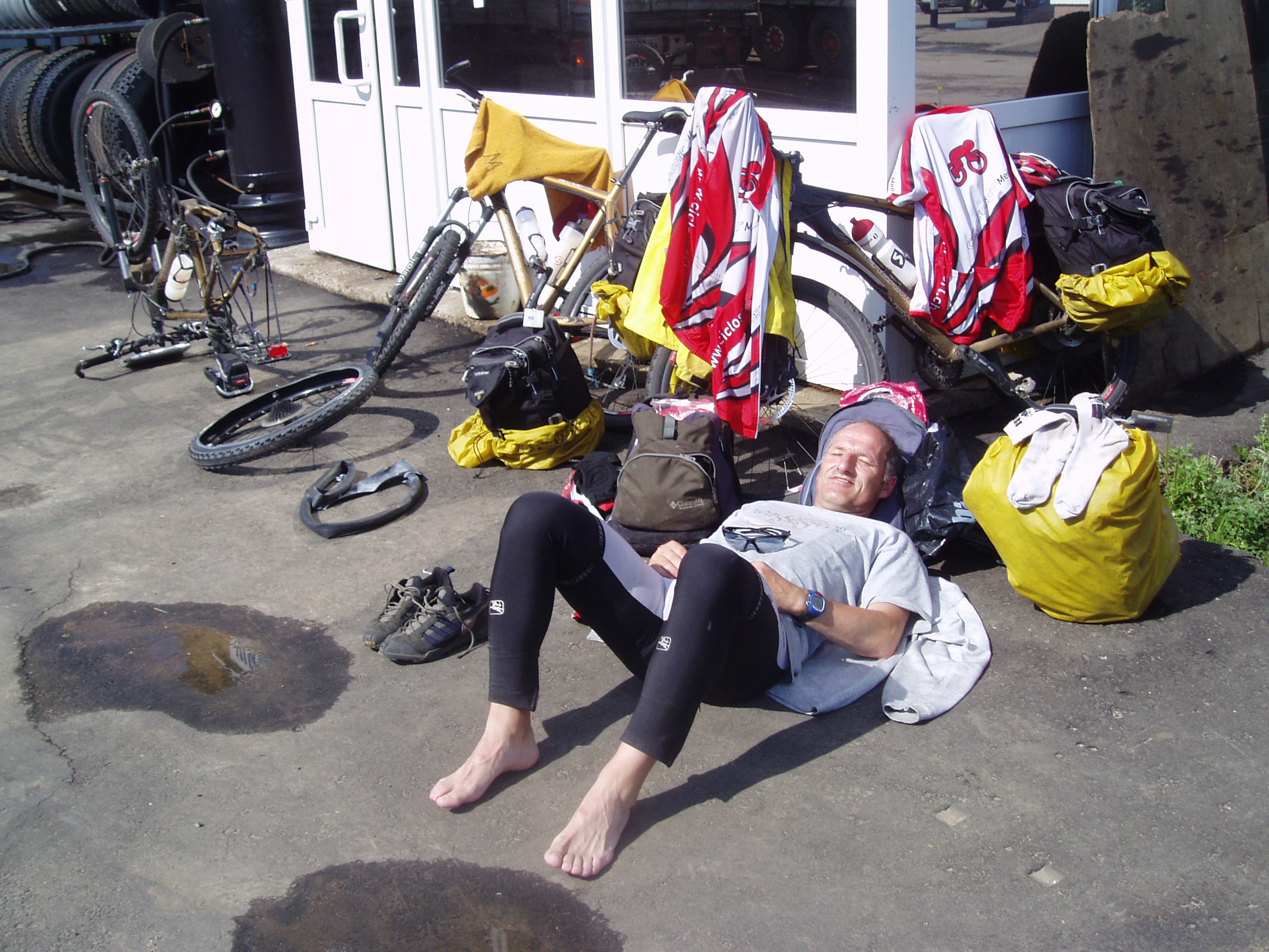Auch der Defektteufel schlug wieder zu. Nach der Reparatur kam Beat knapp 100 m weit bis der Schlauch mit einem lauten Knall platzte. Aufgrund früherer Defekte hatten wir nun keinen der drei mitgeführten Reserveschläuche übrig. Bei einem weiteren Zwischenhalt nach ca. 65 Km wollten wir unseren Reifendruck an einer Tankstelle wieder optimieren. 6 Bar waren zuviel. Beat kam keine 2 m weit und es knallte wieder. Kein Reserveschlauch mehr – was nun?