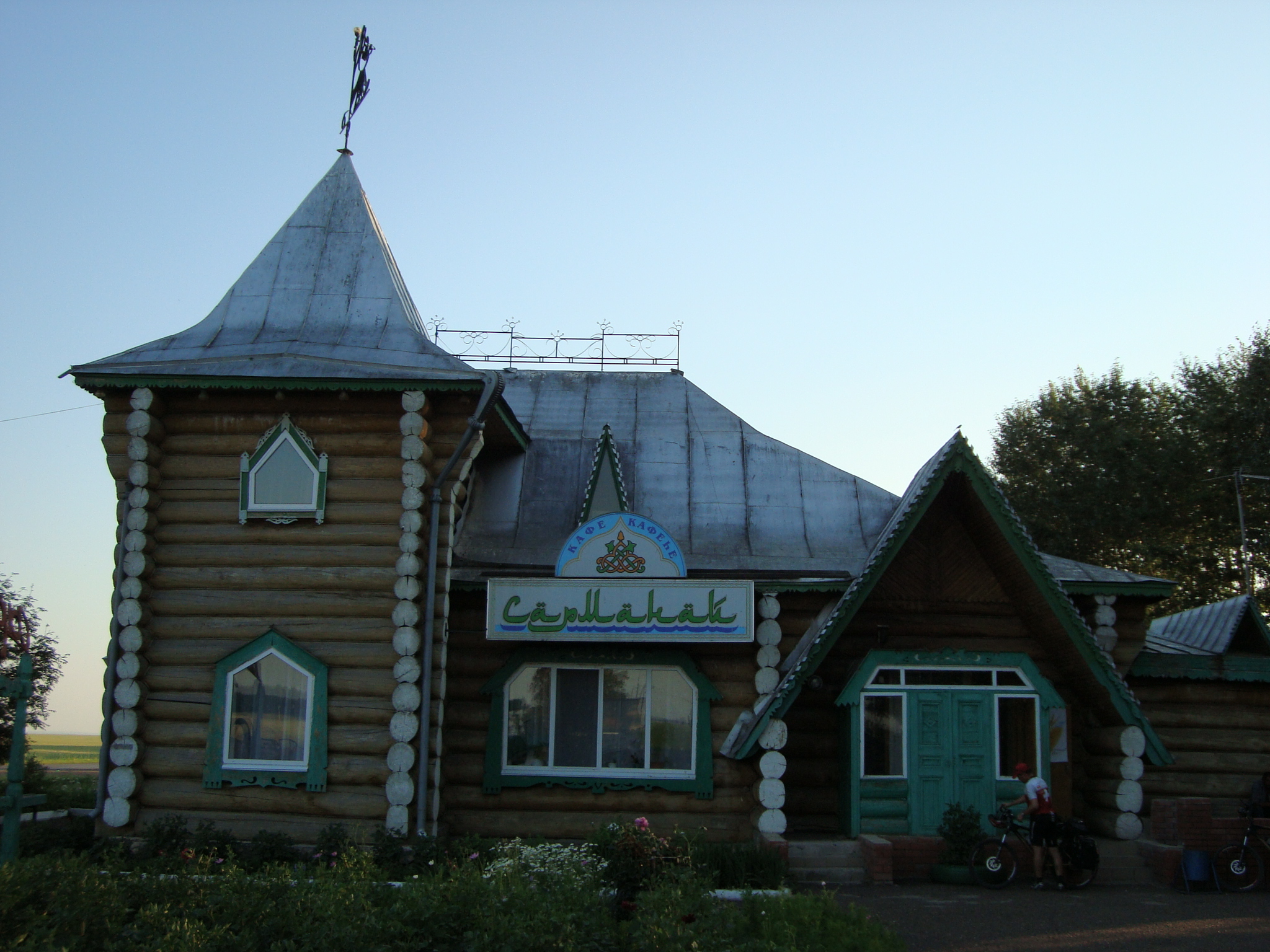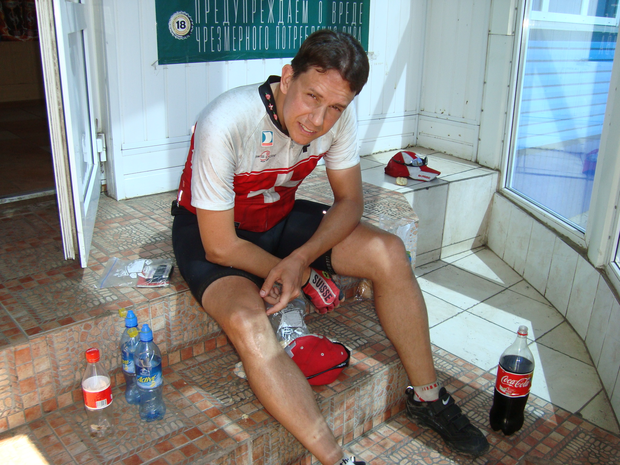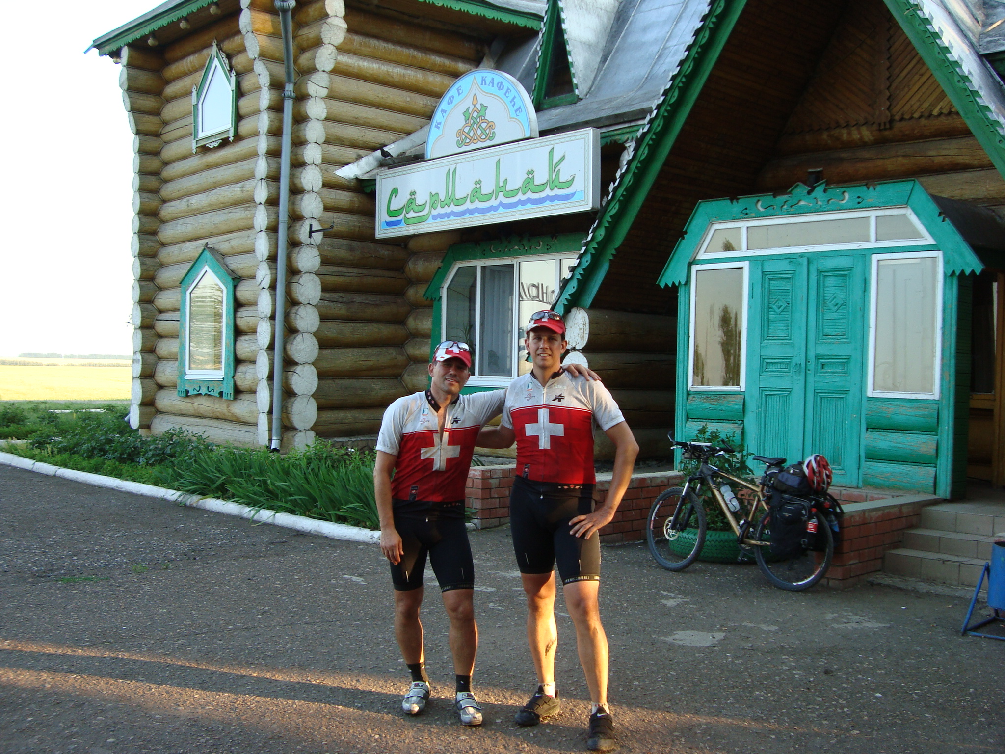 Jeder von uns hat ca. 8l Flüssigkeit zu sich genommen. Nach 130 Km verliessen wir die Republik Tatarstan und stiessen ins Land der Bashkiren vor. Trotz der überraschend guten Strassen mussten wir für die 189 Km leiden. Leider fanden wir an unserem Etappenziel kein Hotel vor. Total abgekämpft, mussten wir noch eine Bleibe für die Nacht organisieren. Glücklicherweise fanden wir eine Raststätte. Die Wirtin erlaubte uns in einer Ecke ihres kleinen Restaurants unsere Schlafsäcke auszubreiten. Ein Lavabo mit kaltem Wasser ersetzte die warme Dusche.