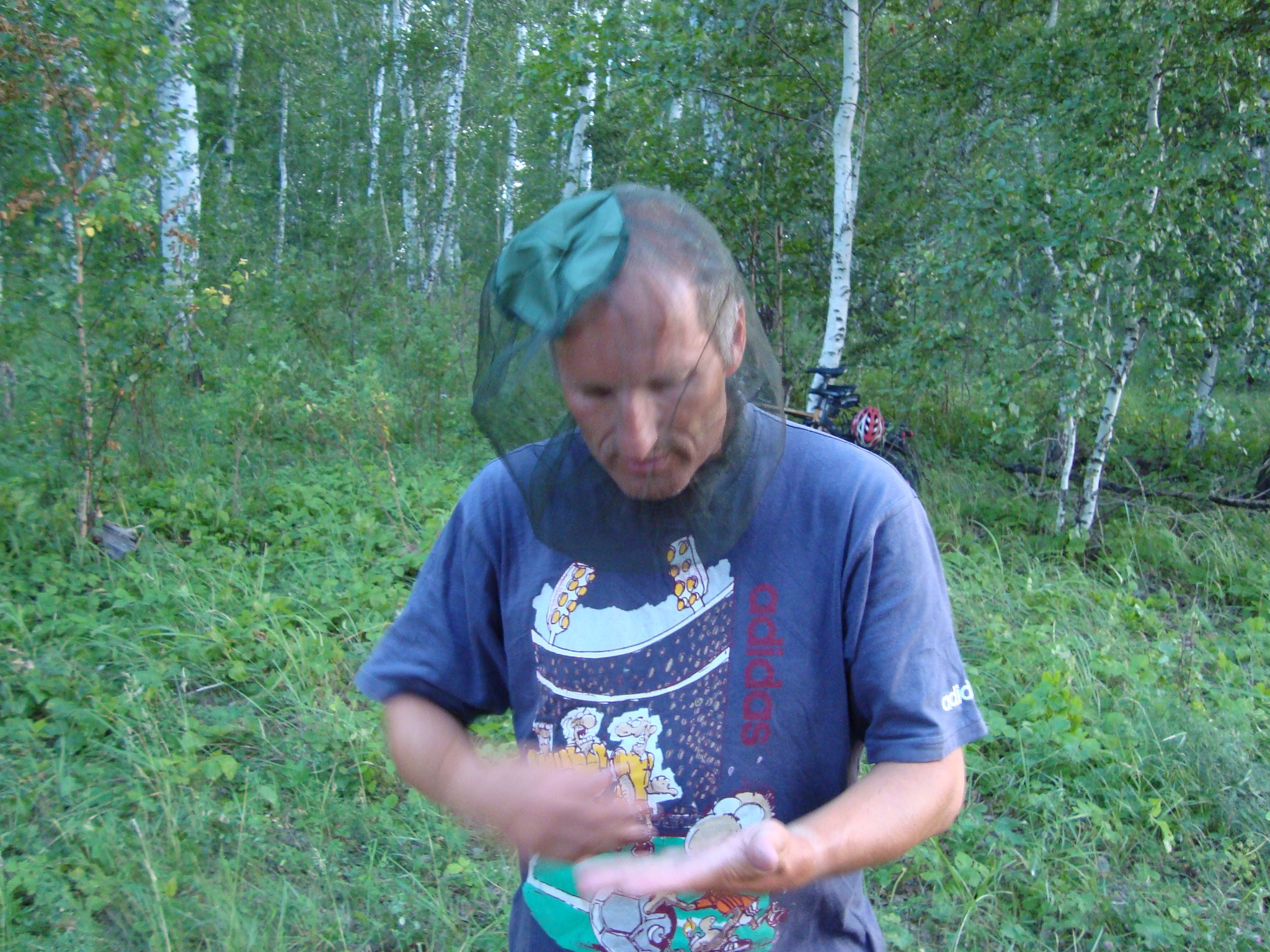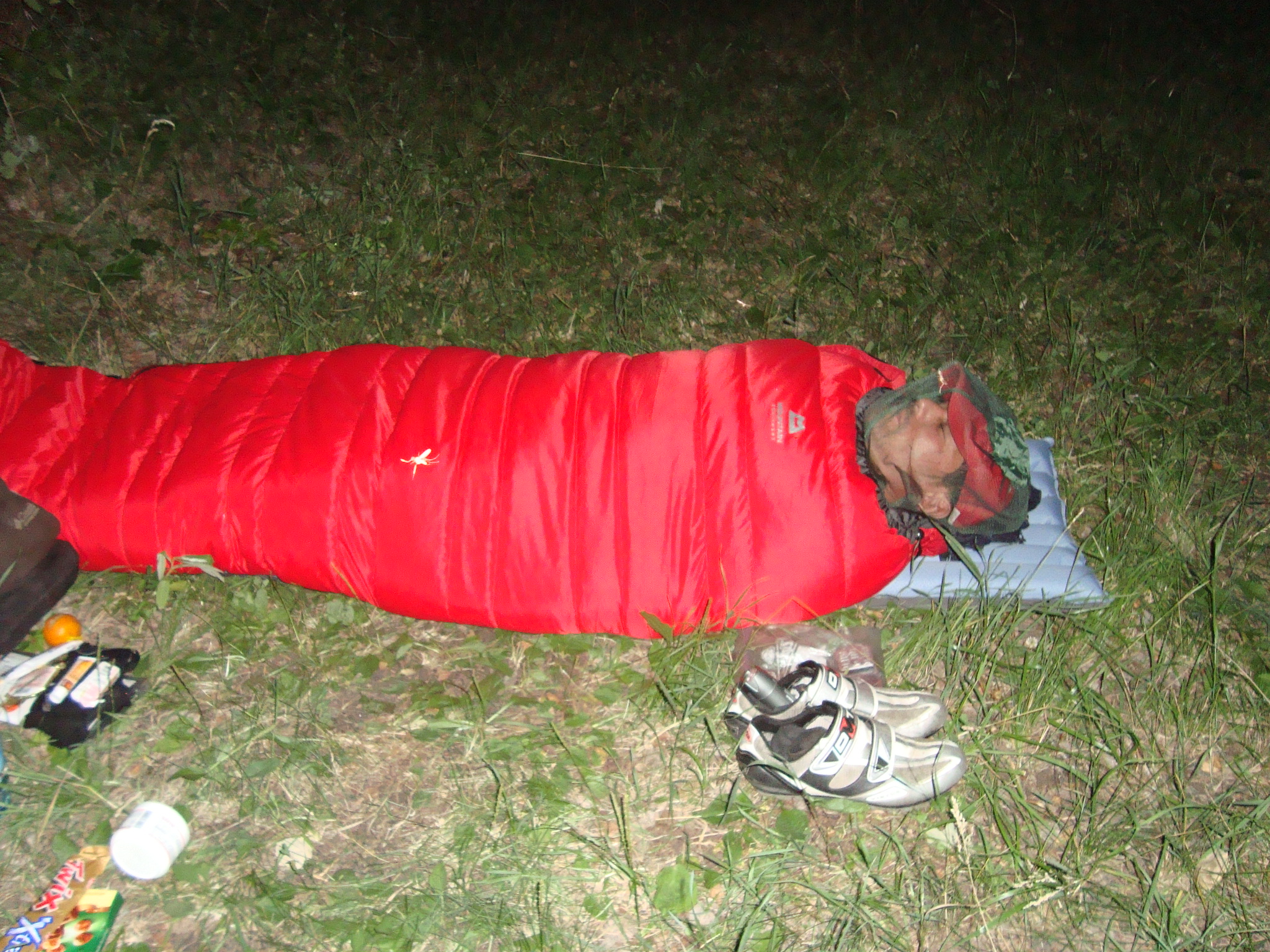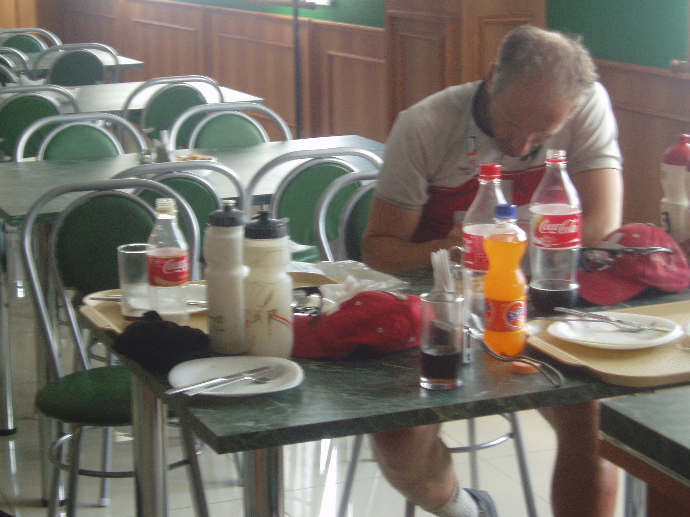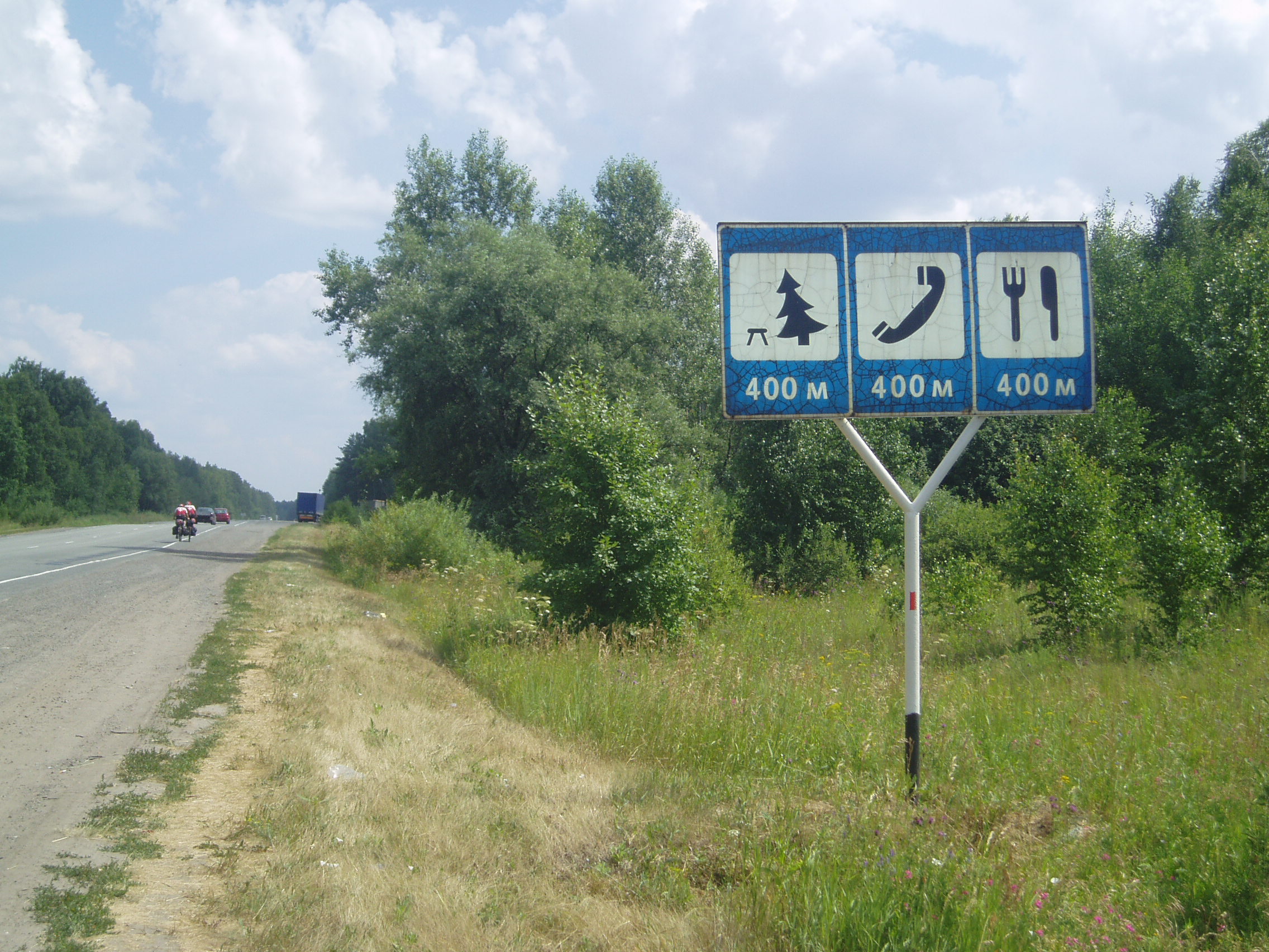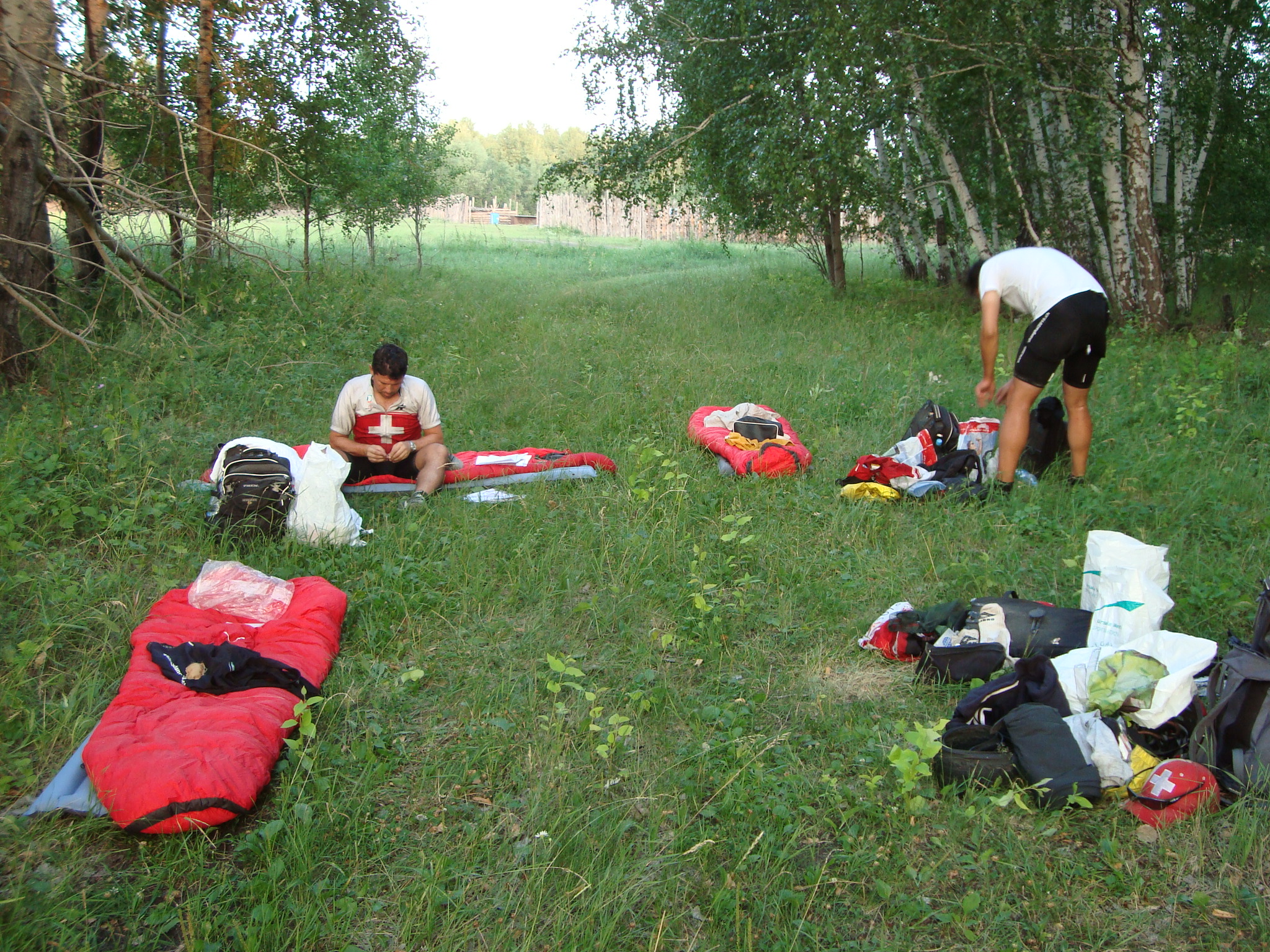 Am geplanten Tagesziel fanden wir leider nur eine verwaiste Tankstelle mit einem leeren Cola-Getränkeschrank. Als wir Einheimische nach einer Raststätte fragten erhielten wir die unterschiedlichsten Antworten von 10 bis 70 Km. Wir traten nochmals in die Pedale und erreichten nach weiteren 10 Km eine Raststätte, wo wir etwas Warmes essen konnten. Mangels Alternativen schlugen wir unser Nachtlager in einem Birkenwald unter freiem Himmel auf.