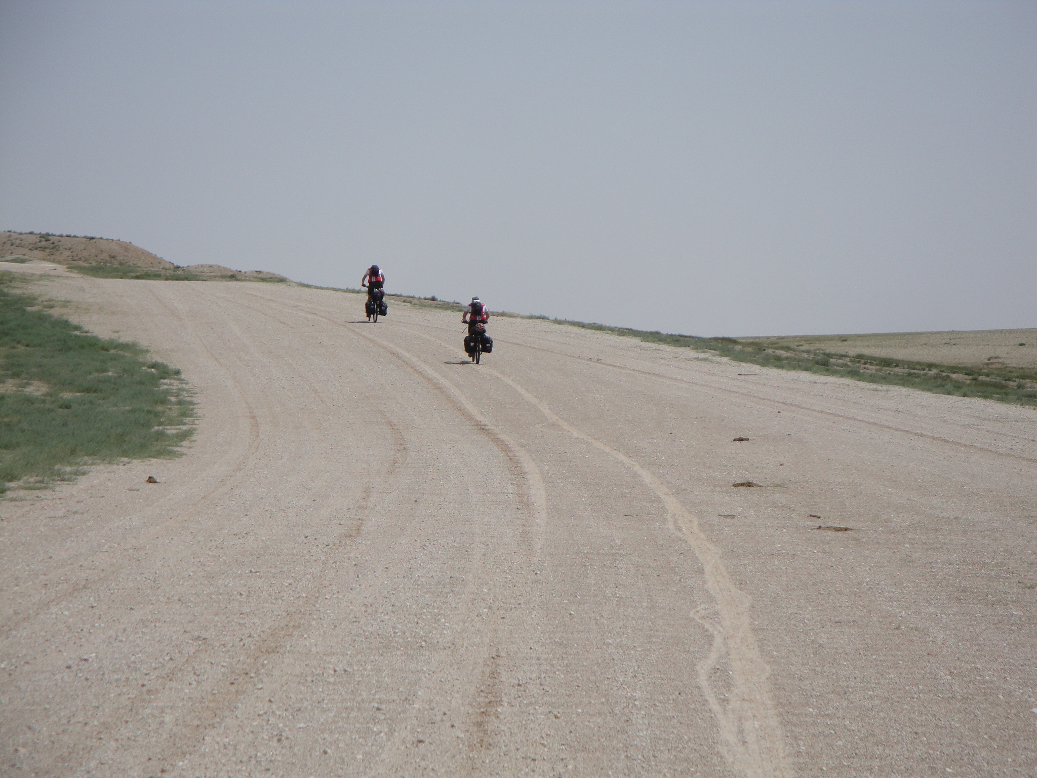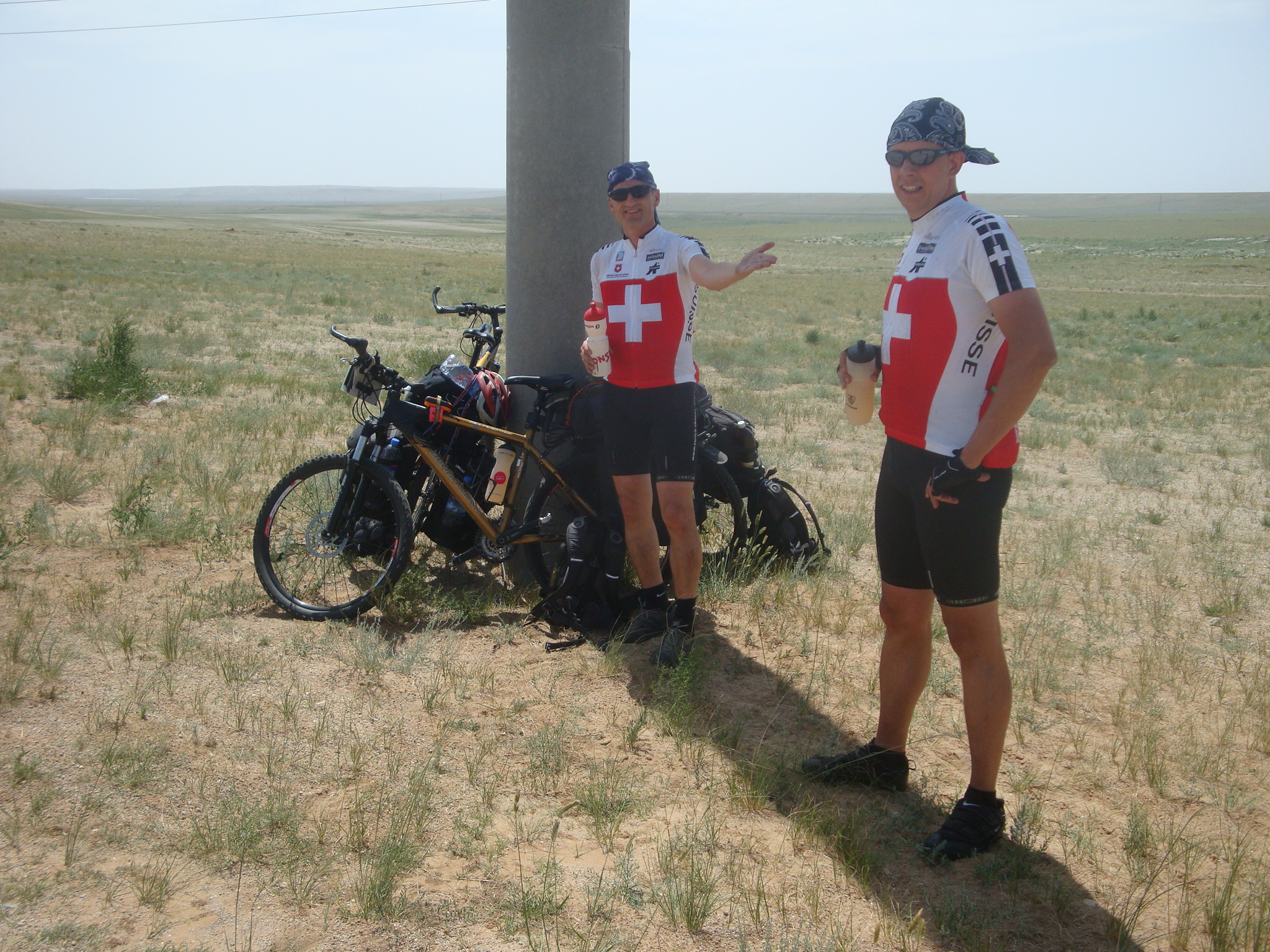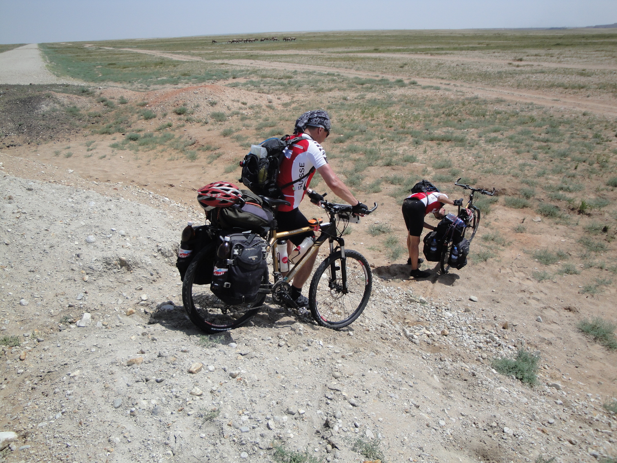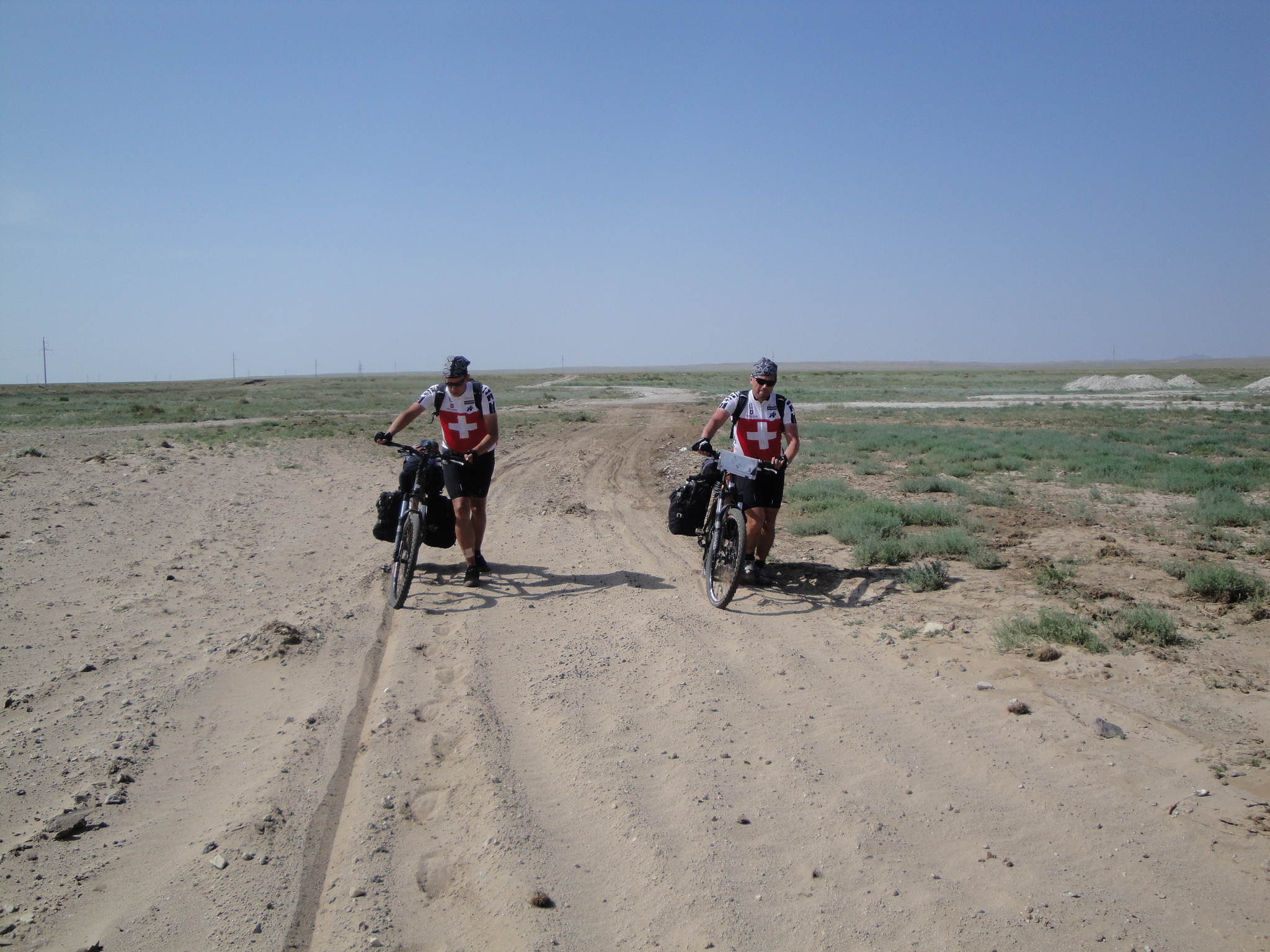Um 12:00 fuhren wir los und nach 8 Km war die asphaltierte Strasse zu Ende und wir wechselten auf die Sandpiste. Schnell wurde klar, dass die gestrige Monsteretappe ihren Tribut forderte. Bei 45 Grad und gleissender Sonne, kamen wir nur sehr schleppend voran. Bei den Zwischenstopps suchten wir vergebens nach schattenspenden Bäumen oder Sträuchern. Abschnittsweise war der Sand so tief, dass wir unsere Bikes stossen mussten. Da spürten wir die ca. 32 Kg Gepäck inkl. Wasserreserven.