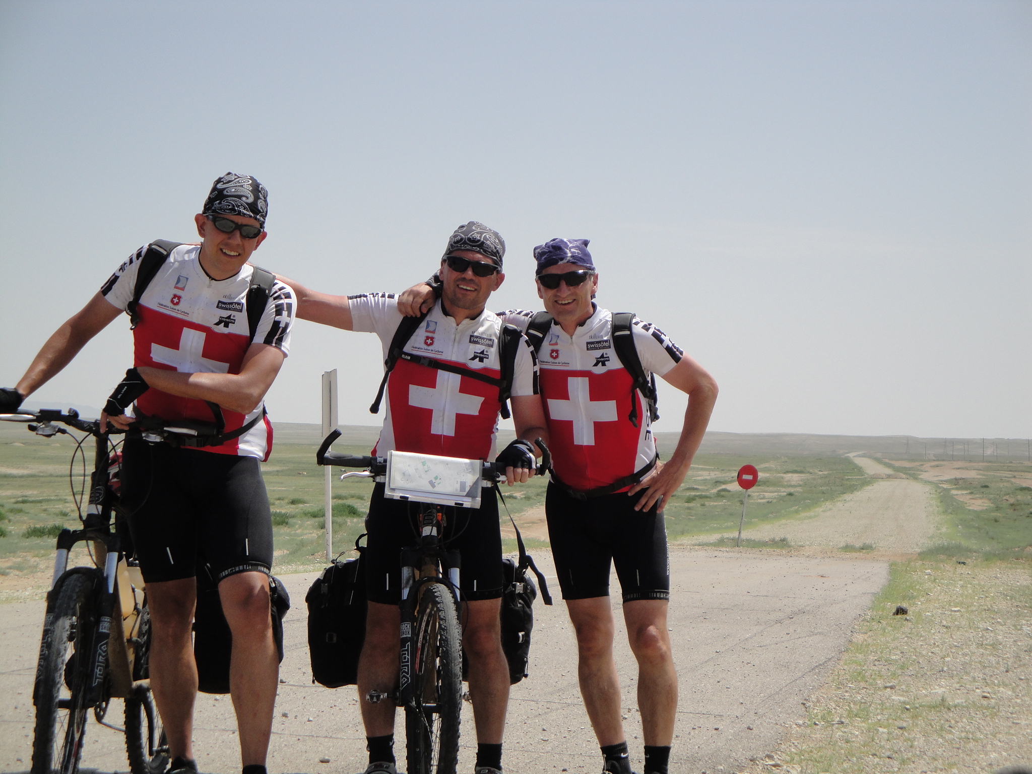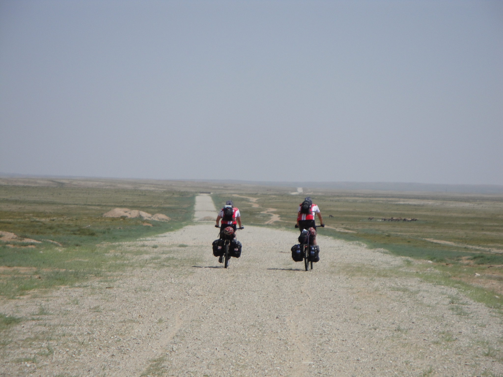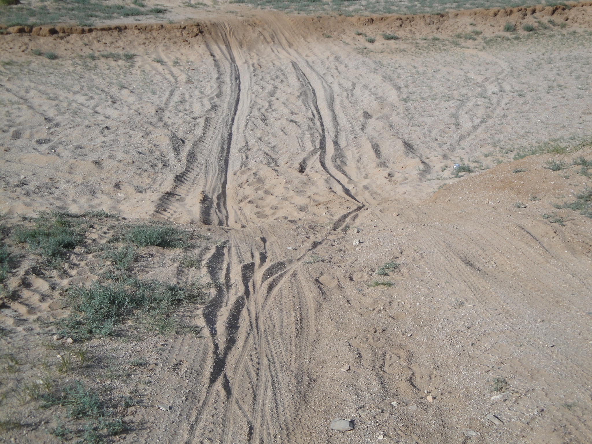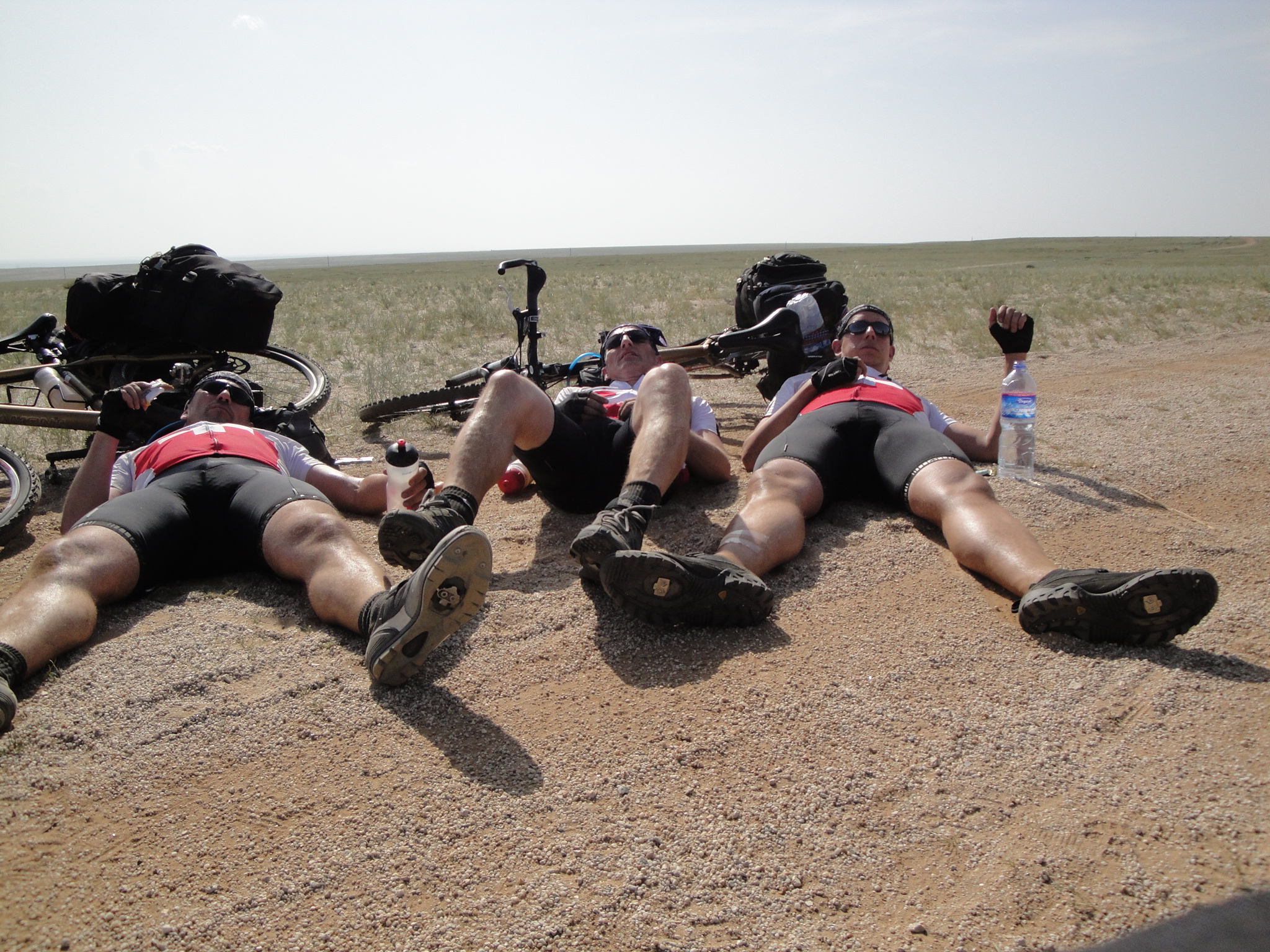 Um 12:00 fuhren wir los und nach 8 Km war die asphaltierte Strasse zu Ende und wir wechselten auf die Sandpiste. Schnell wurde klar, dass die gestrige Monsteretappe ihren Tribut forderte. Bei 45 Grad und gleissender Sonne, kamen wir nur sehr schleppend voran. Bei den Zwischenstopps suchten wir vergebens nach schattenspenden Bäumen oder Sträuchern. Abschnittsweise war der Sand so tief, dass wir unsere Bikes stossen mussten. Da spürten wir die ca. 32 Kg Gepäck inkl. Wasserreserven.
