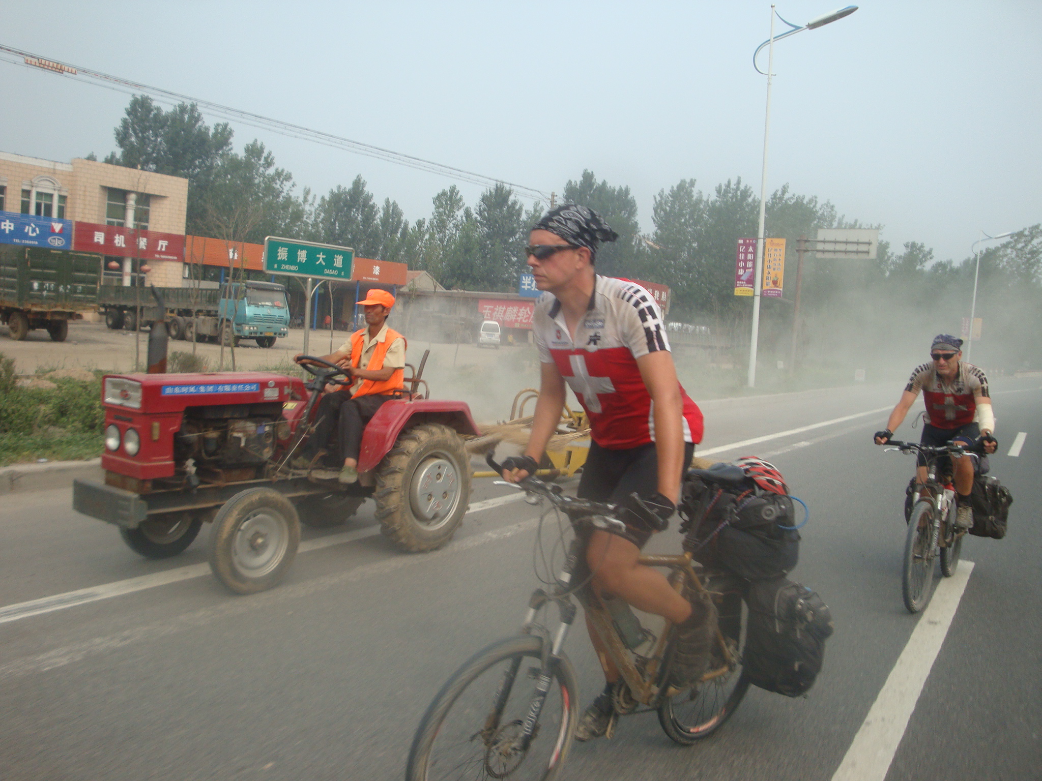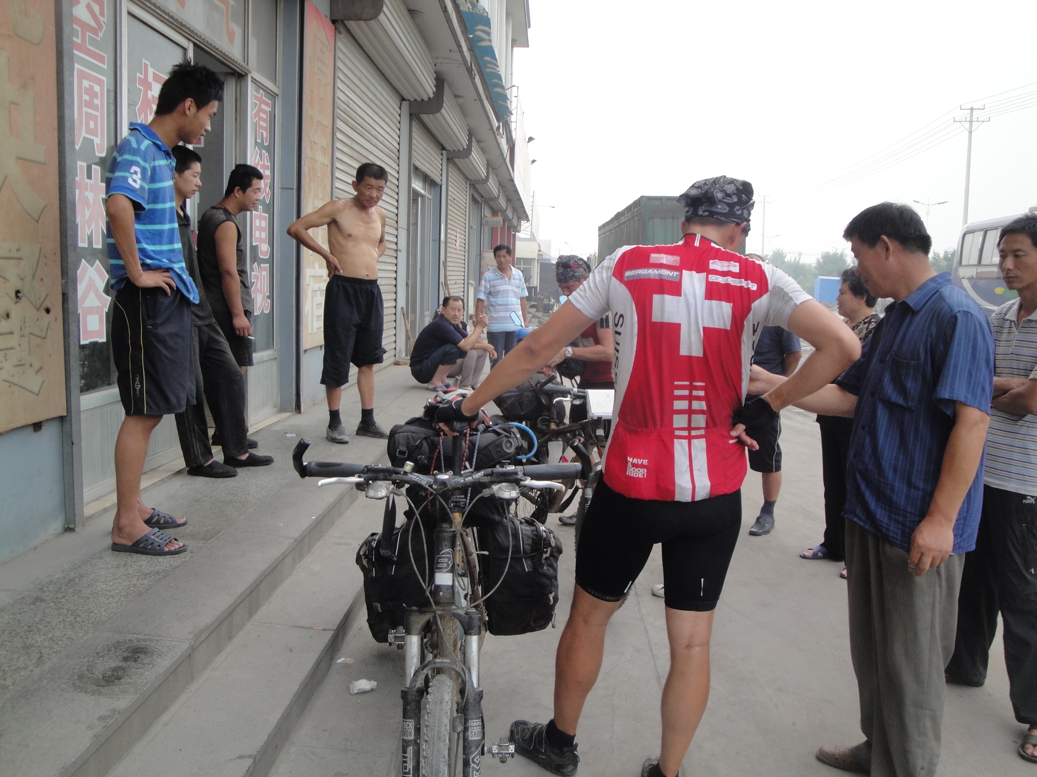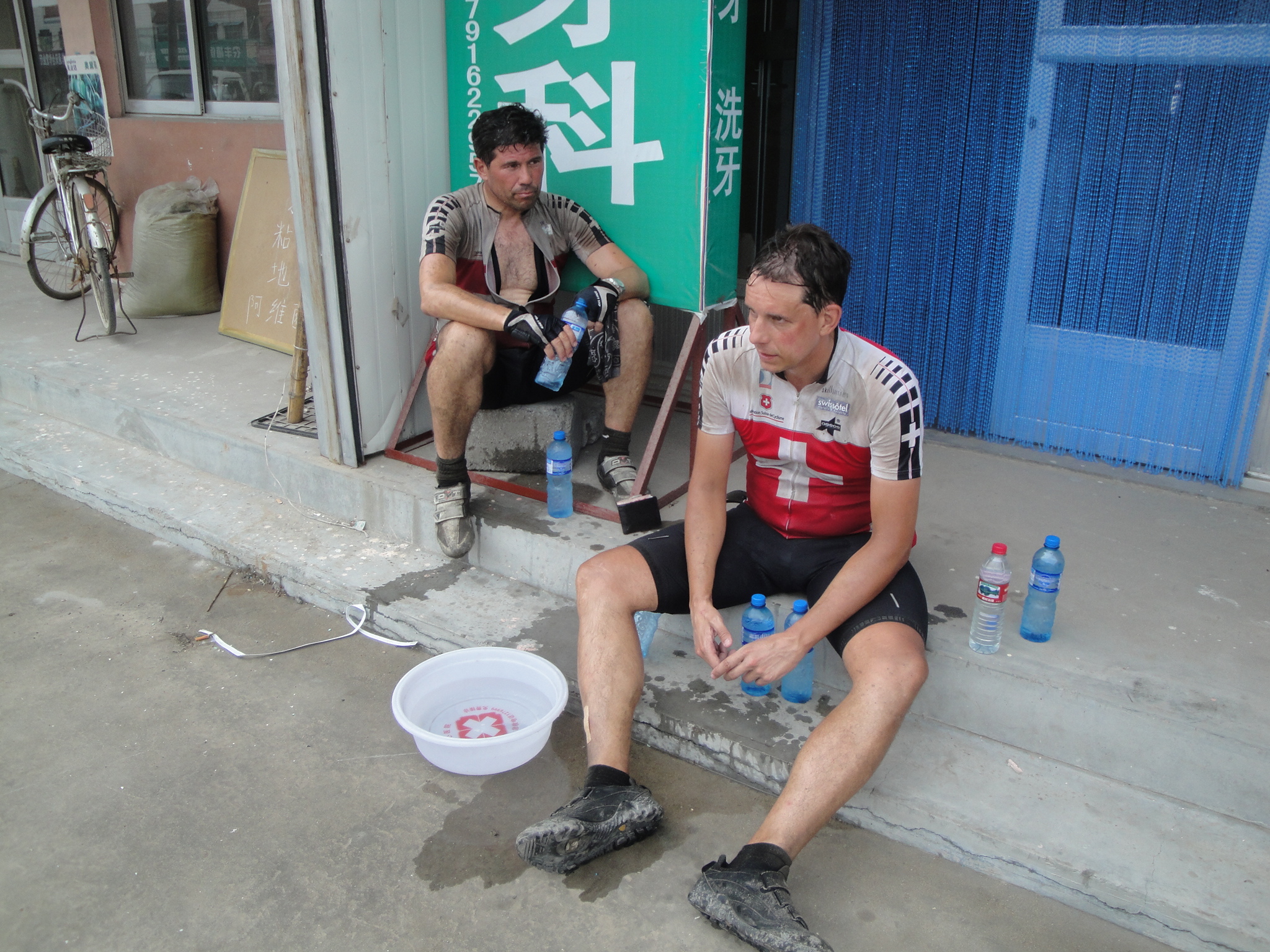Wir erleben die Chinesen als sehr zuvorkommend und hilfsbereit. Oftmals stellen Sie während unseren Pausen ein Becken mit Wasser zur Abkühlung bereit. Heute reichte uns sogar ein Lastwagenfahrer während der Fahrt Mineralwasser aus dem Fenster. Auch dem Material machen diese extremen Bedingungen schwer zu schaffen. Kurz vor dem Tagesziel mussten wir wieder einen Plattfuss beheben. In Linqu fanden wir ein gutes Hotel und legten uns früh zur Ruhe.