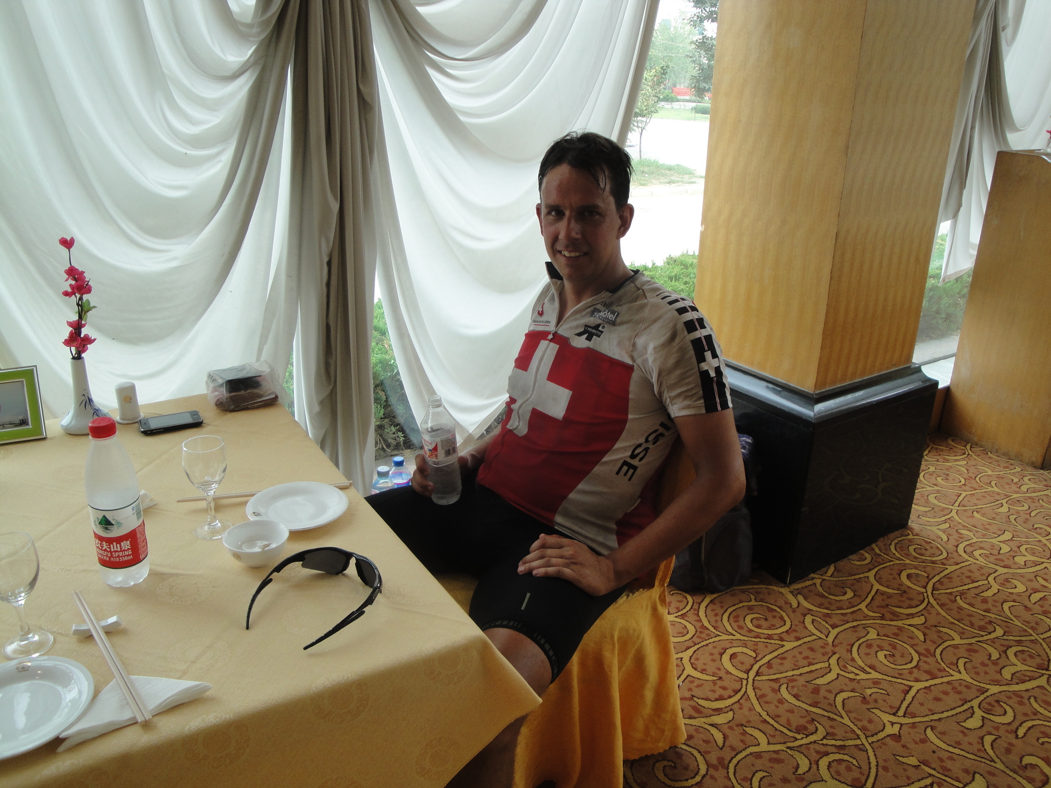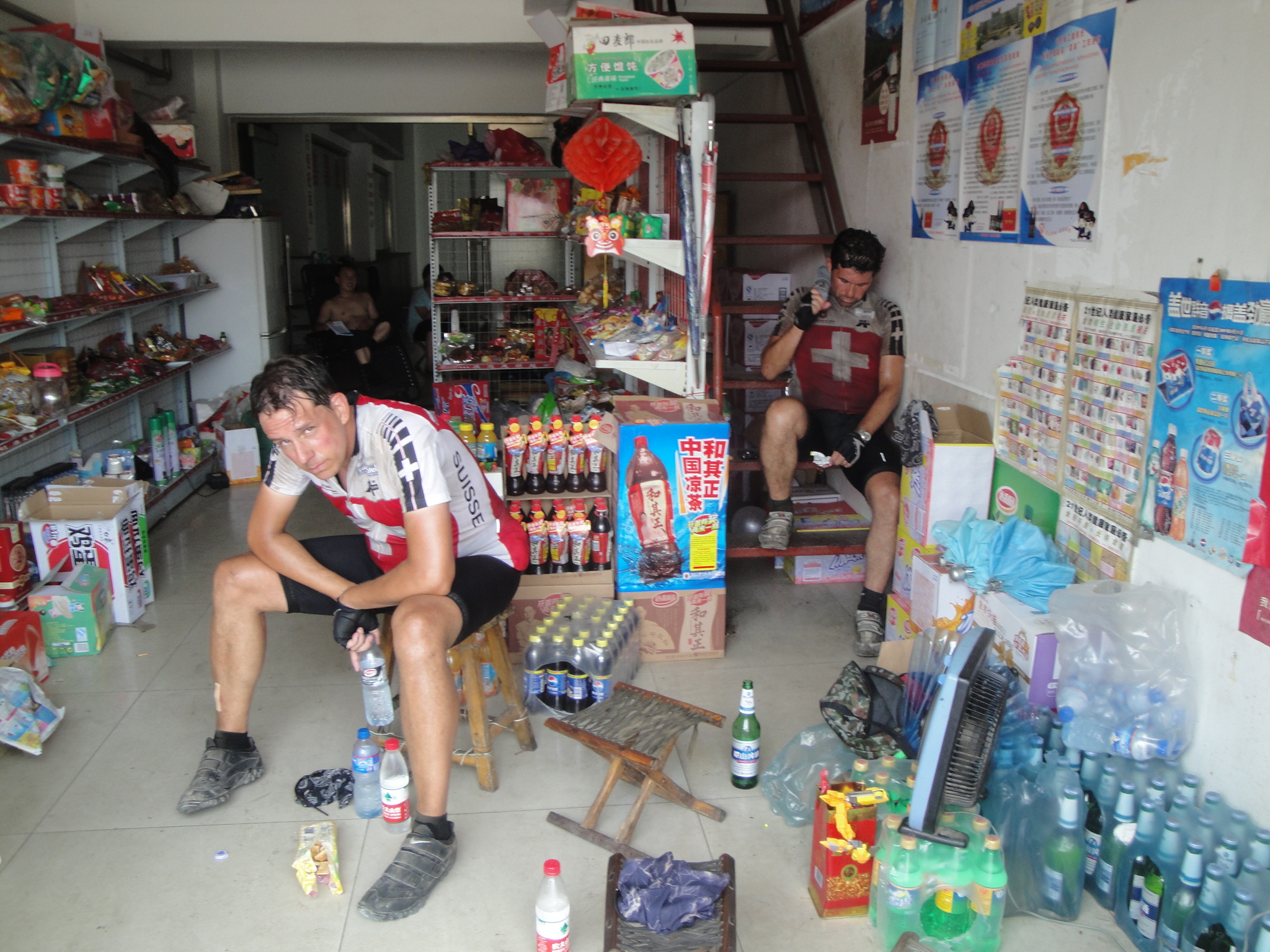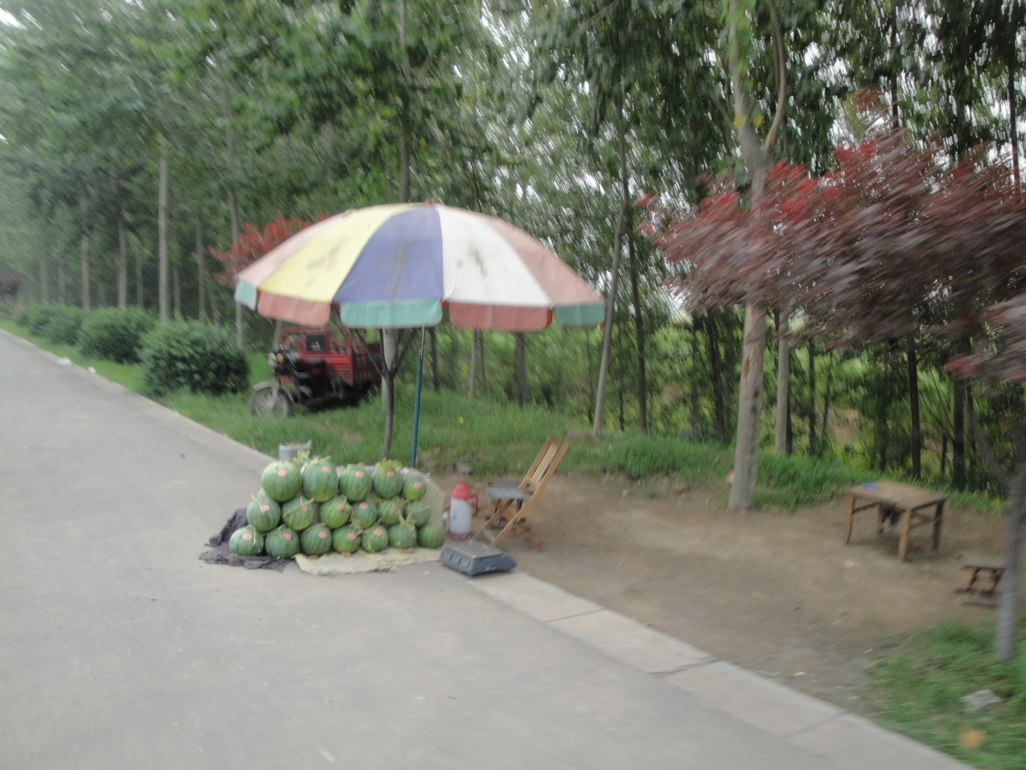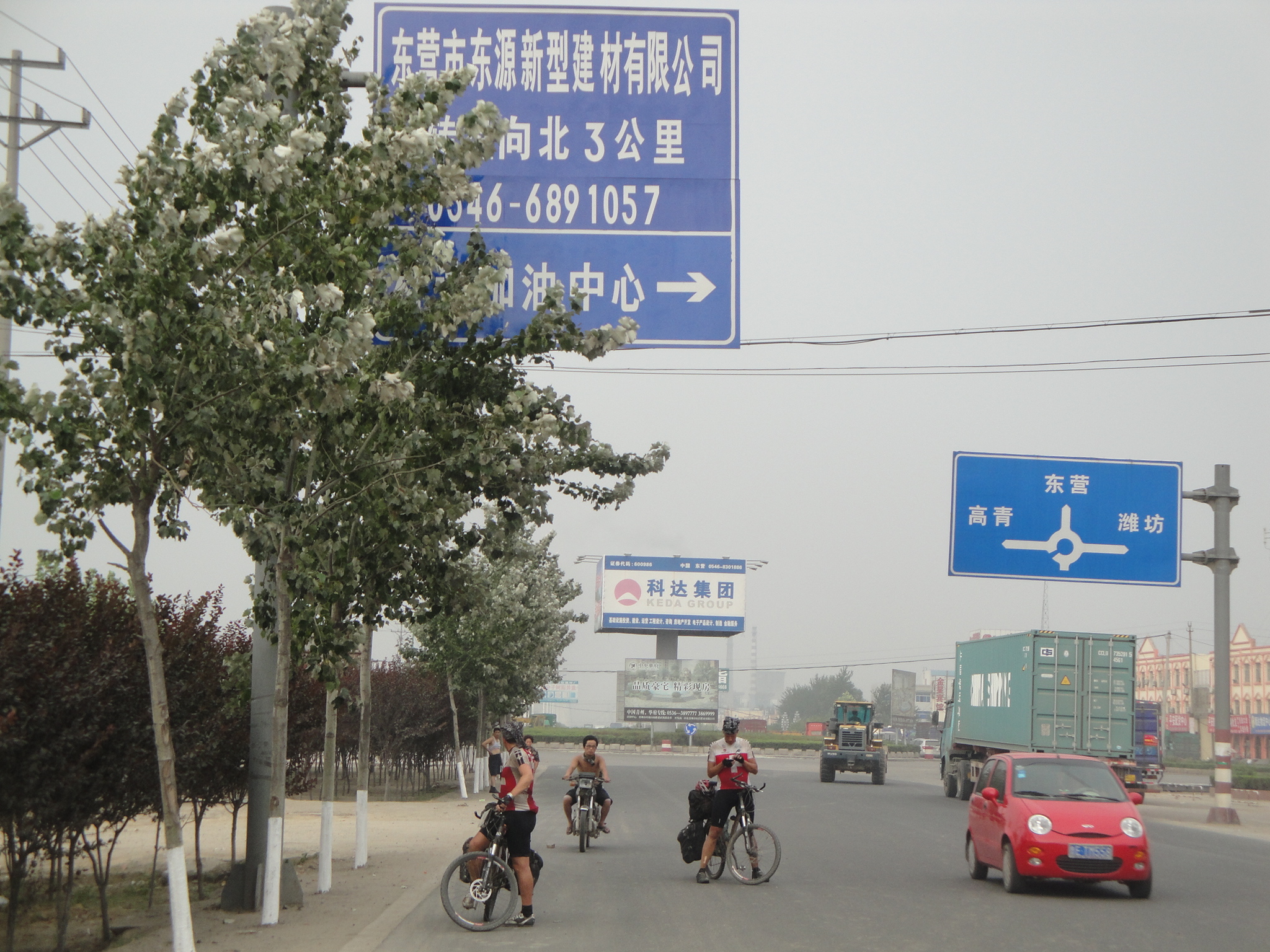 Wir erleben die Chinesen als sehr zuvorkommend und hilfsbereit. Oftmals stellen Sie während unseren Pausen ein Becken mit Wasser zur Abkühlung bereit. Heute reichte uns sogar ein Lastwagenfahrer während der Fahrt Mineralwasser aus dem Fenster. Auch dem Material machen diese extremen Bedingungen schwer zu schaffen. Kurz vor dem Tagesziel mussten wir wieder einen Plattfuss beheben. In Linqu fanden wir ein gutes Hotel und legten uns früh zur Ruhe.