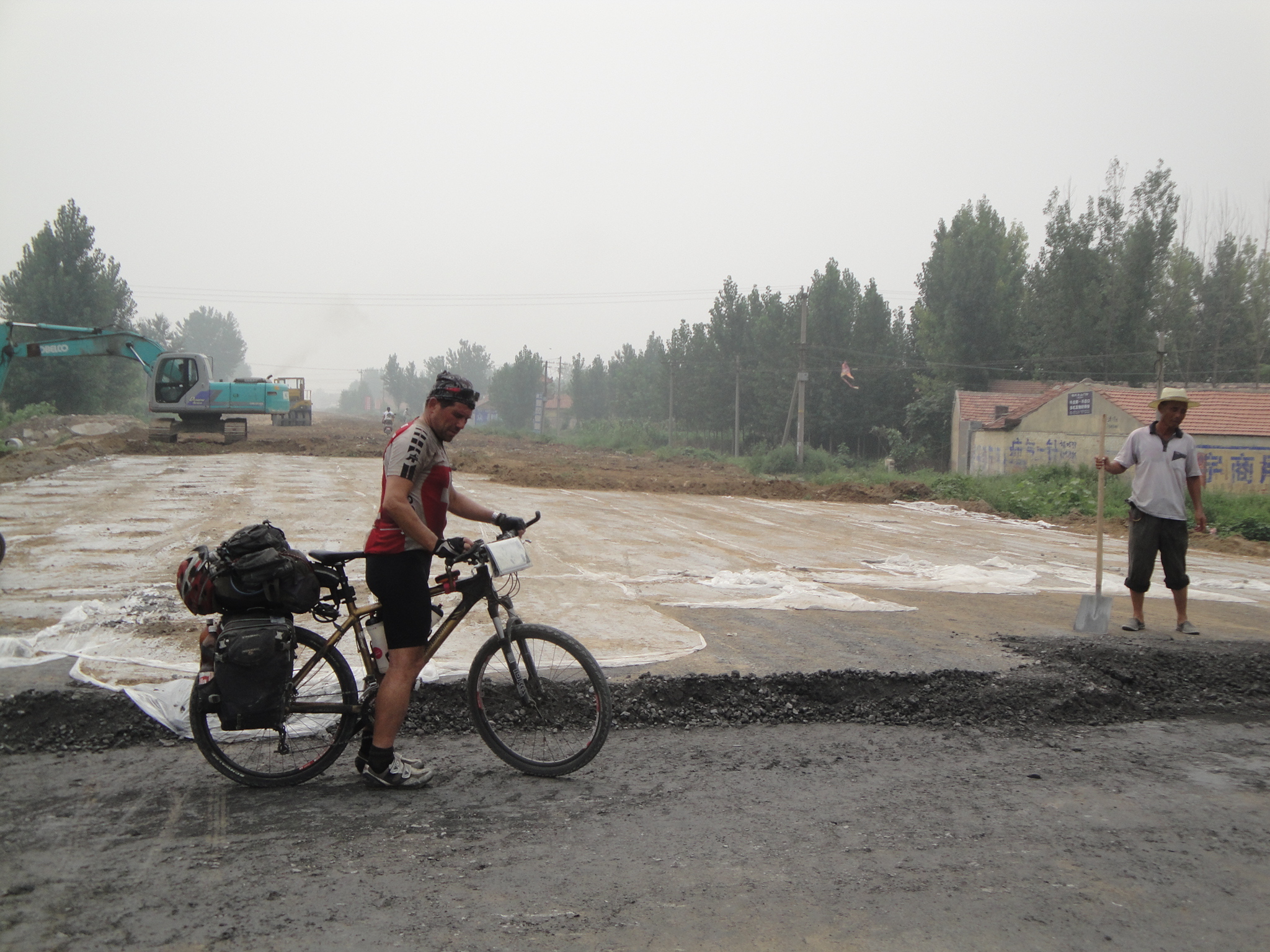Als wir um 07:30 losfuhren, war es bereits 33 Grad und die Luft war zum Abschneiden. Die Sonne sahen wir den ganzen Tag nur umrissartig durch die dicke Dunstglocke, die aufgrund der ungeheuren Luftfeuchtigkeit über dem Himmel hing. Auf unserem direkten Weg Richtung Süden standen wir plötzlich vor einer Baustelle. Die Strasse vor uns war nur noch aufgewühltes Erdreich und es gab selbst für uns kein Durchkommen mehr. Wir mussten umkehren und eine Umfahrungsroute suchen.