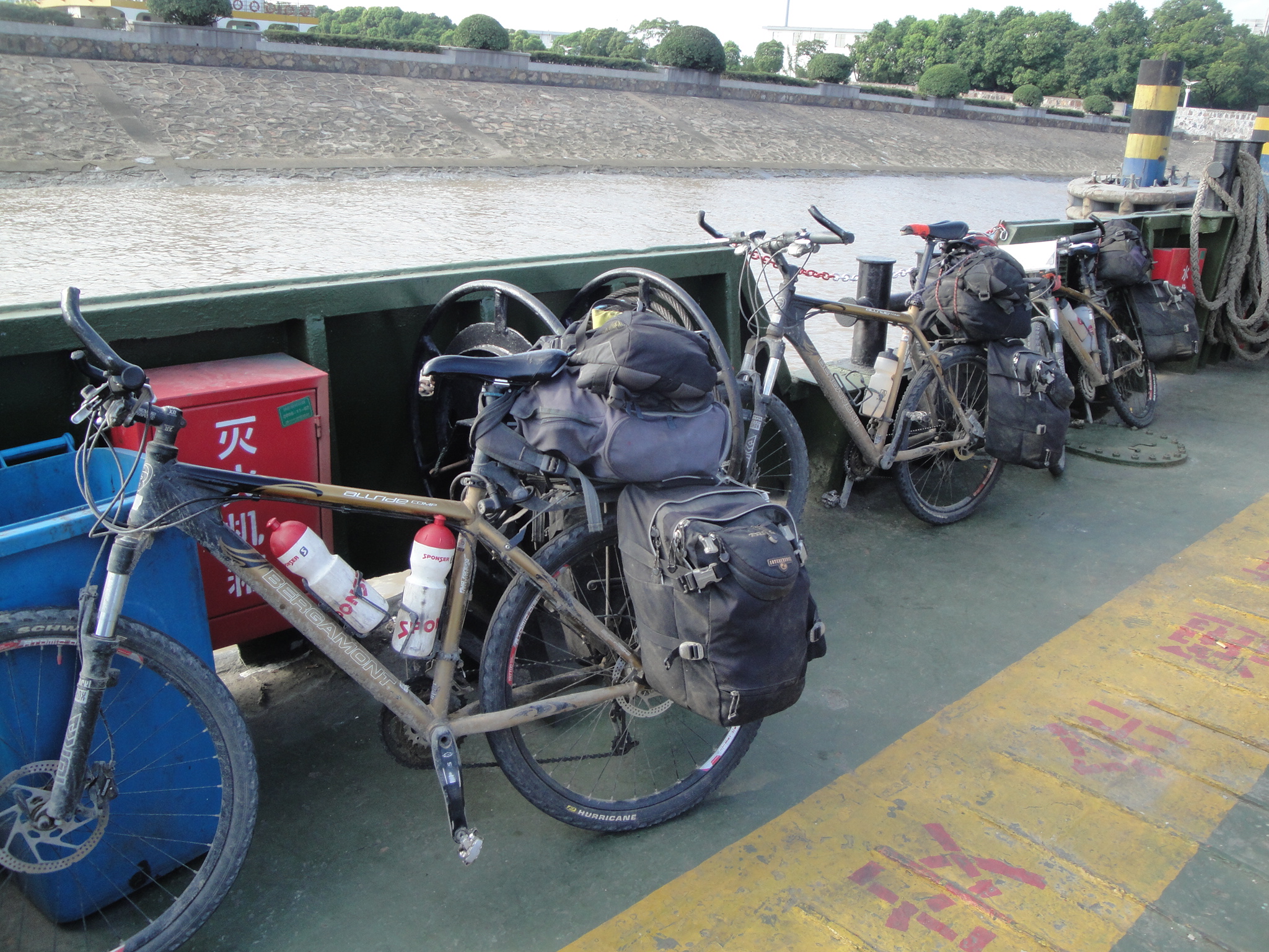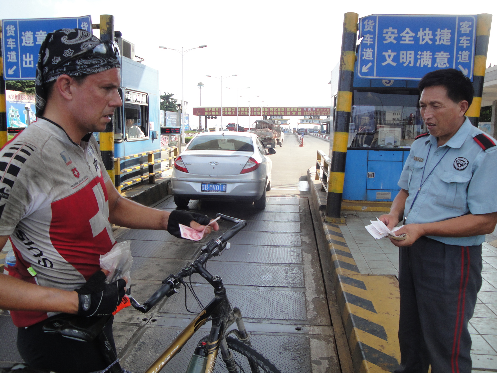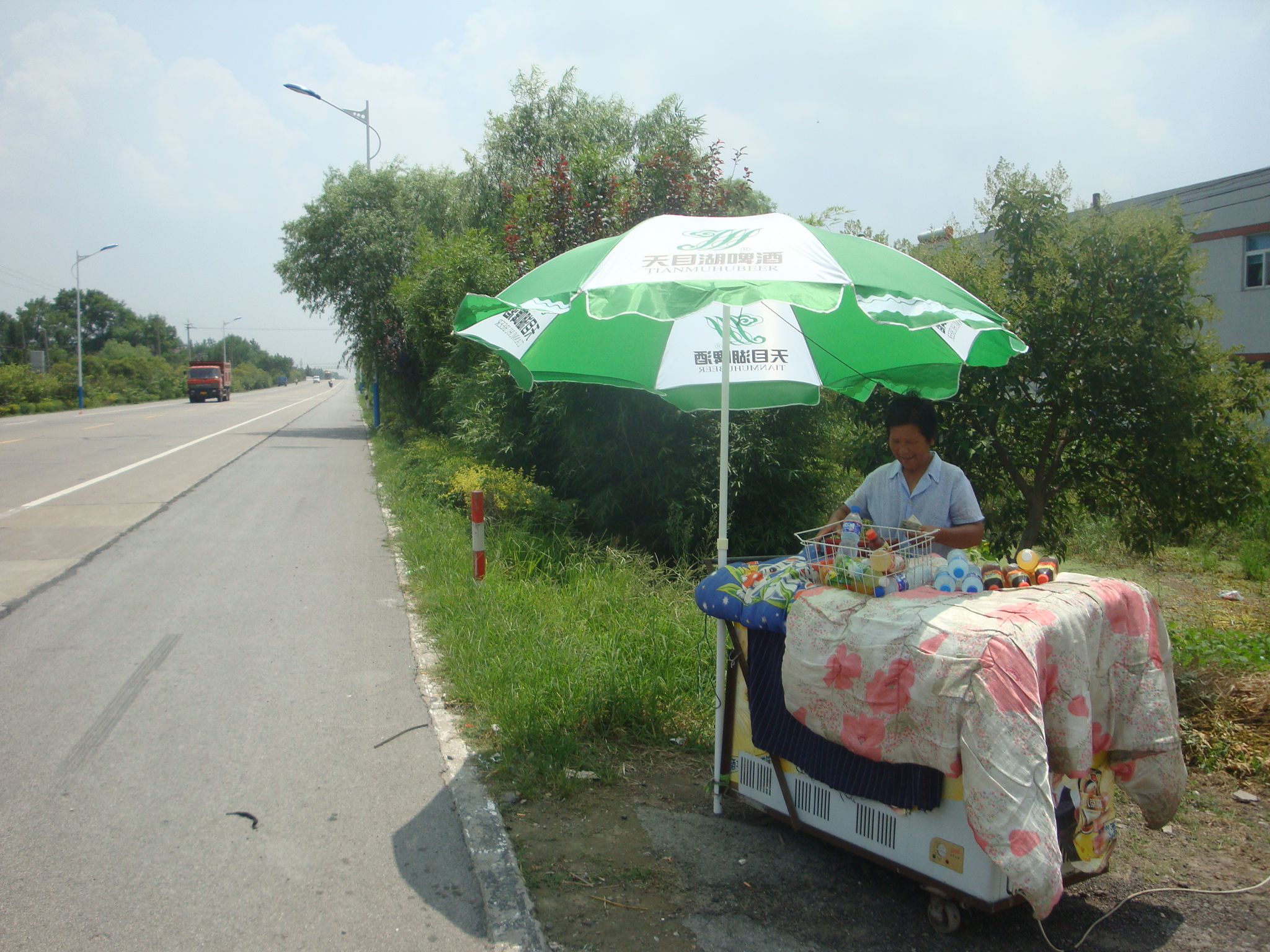 Bei unseren gewohnten Stundenhalts hielten wir jeweils Ausschau nach den Kühltruhen mit Schattenplatz am Strassenrand. Wir entschieden uns weiter als das ursprünglich geplante Tagesziel Nantong zu fahren und den Meeresarm nördlich von Shanghai bereits heute noch zu überqueren.