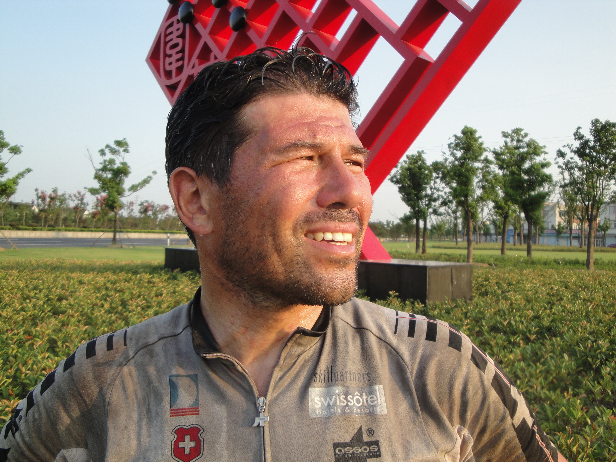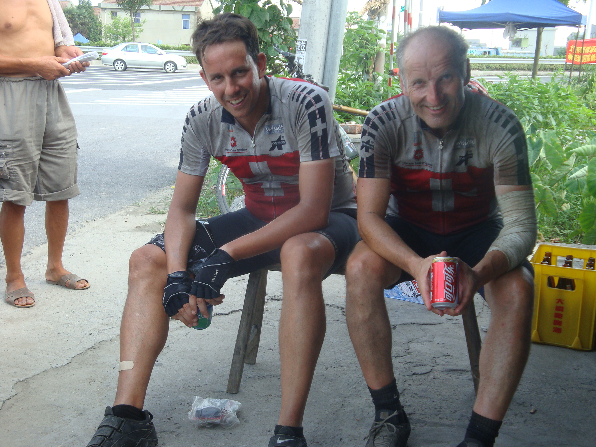 Noch keine Radumdrehung gefahren und Chefmechaniker Graziano musste wieder einen Plattfuss an Beat’s Bike reparieren. Somit hält Beat den unrühmlichen Rekord von 5 Plattfüssen in Serie.