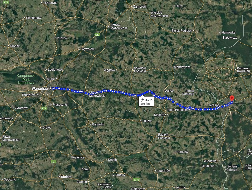 - den 3 km entfernten Bahnhof von Terespol aufzusuchen und mit dem Zug über die Grenze zu gelangen.
