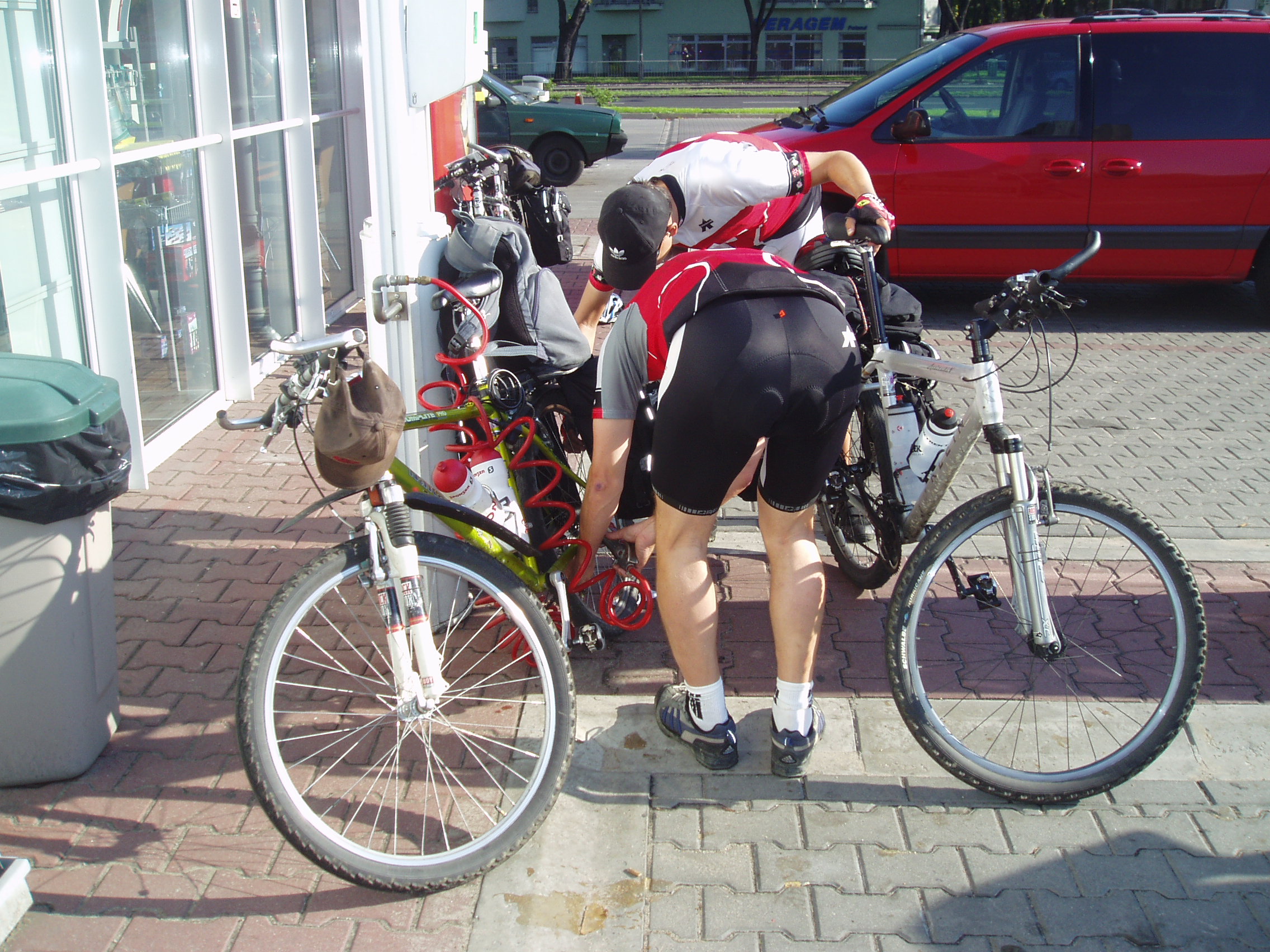 Ohne es zu bemerken, hat auf der letzten Etappe der „Defekt-Teufel“ gleich 2x zugeschlagen: Bei der vorbildlichen Routinenkontrolle am Abend vor dem Start stellten wir an Matt’s Bike einen platten Reifen fest. Chef Monteur Grazi musste einen 2cm langen Nagel aus dem Pneu entfernen und den Schlauch ersetzen. Beim 1. Boxenstopp kurz nach dem Start heute Morgen, um Matt’s Pneu wieder den optimalen Reifendruck zugeben, stellte Grazi mit Entsetzen fest, dass bei seinem Hinterrad eine Speiche, die ihr zugedachte Aufgabe nicht mehr erfüllte – SPEICHENBRUCH !