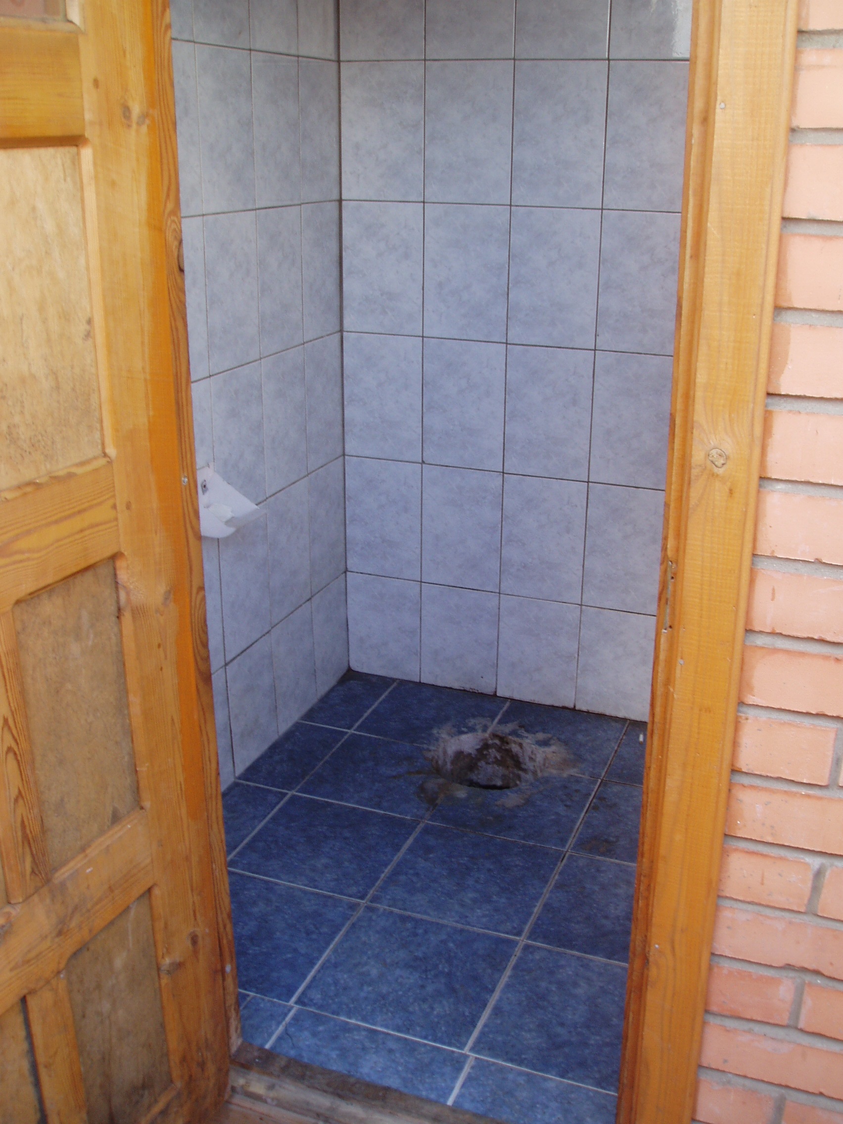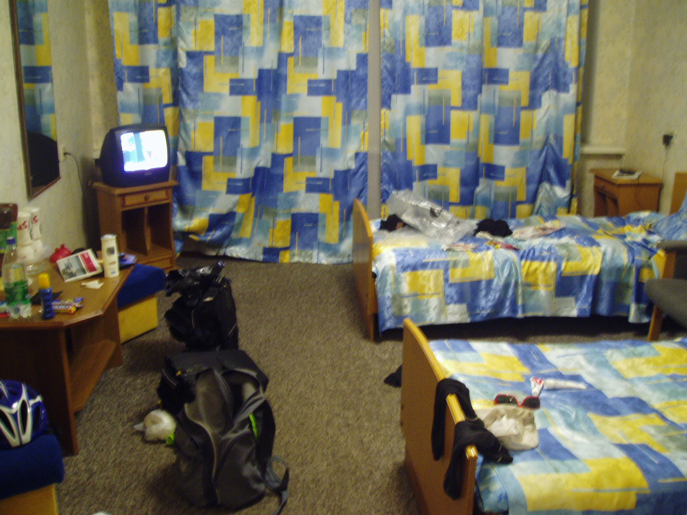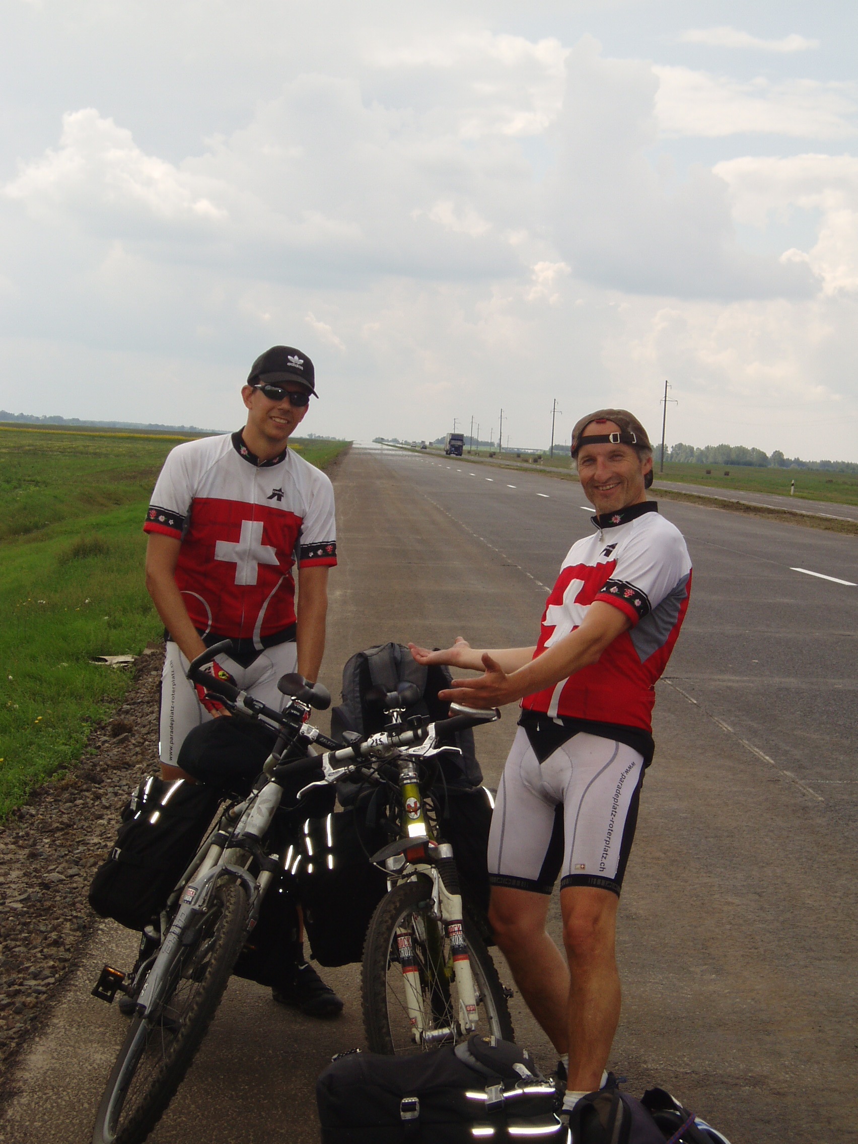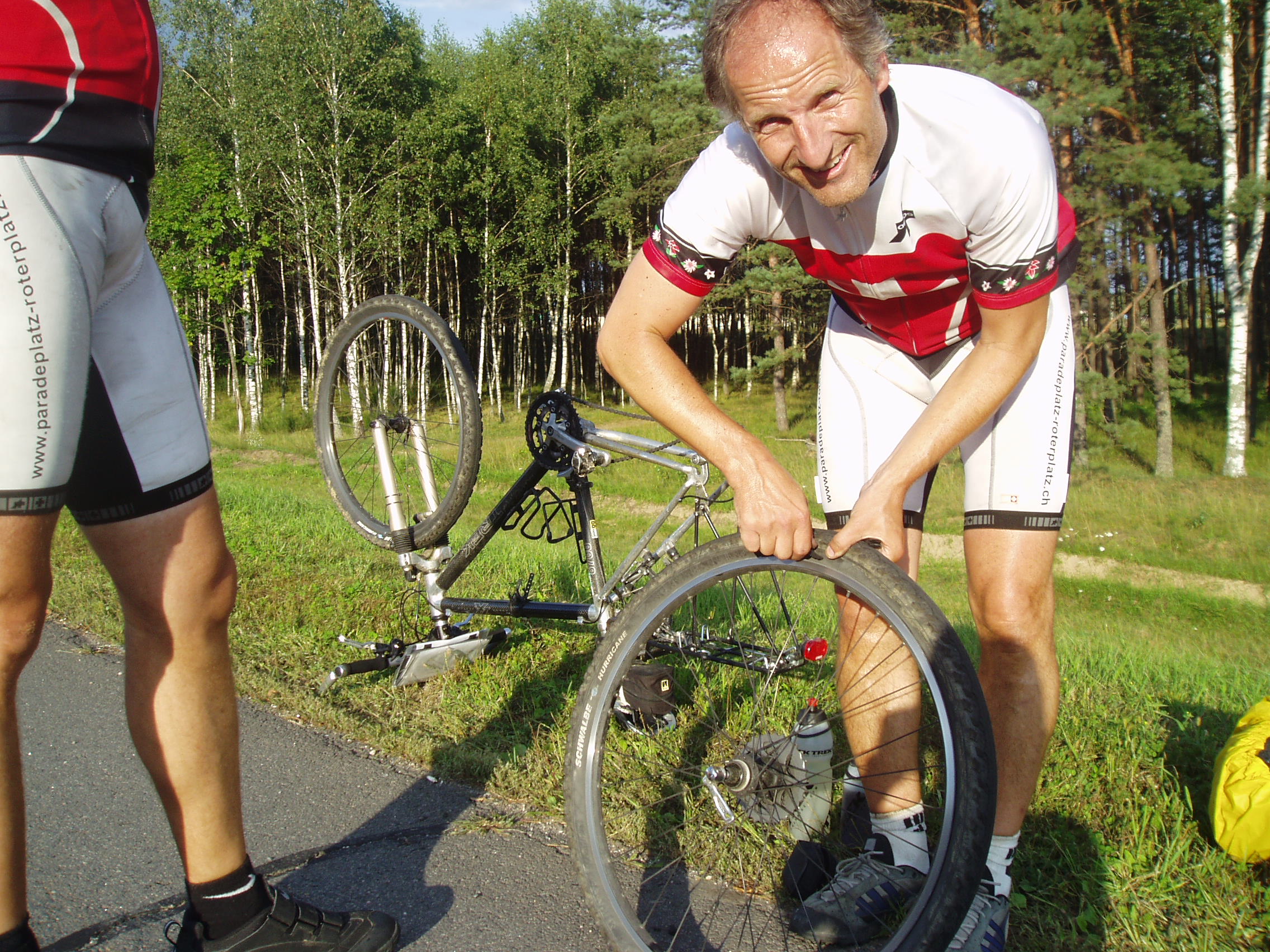 Ca. 20 Km vor dem Ziel schlug der Defekt-Teufel wieder zu! Erstmals traf es auch Beat’s Bike mit einem Plattfuss… Dank dem wiederum professionellen Einsatz von Chefmechaniker Grazi ging kaum wertvolle Zeit verloren. Müde aber glücklich über eine weitere zurückgelegte Etappe freuten wir uns auf eine warme und erholsame Dusche. Die Dusche war dann aber leider weder warm noch erholsam.