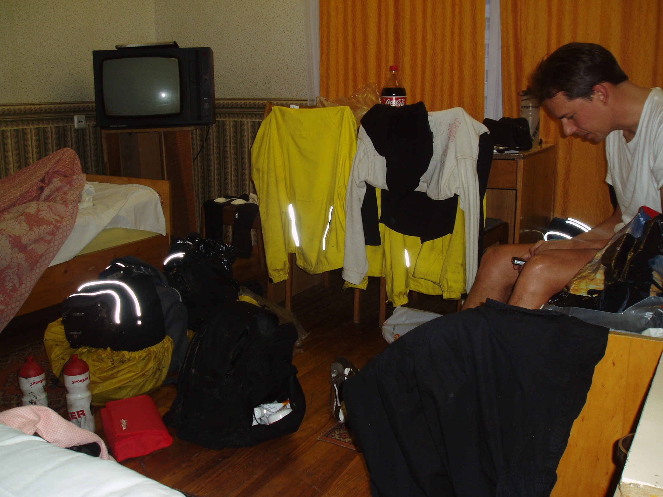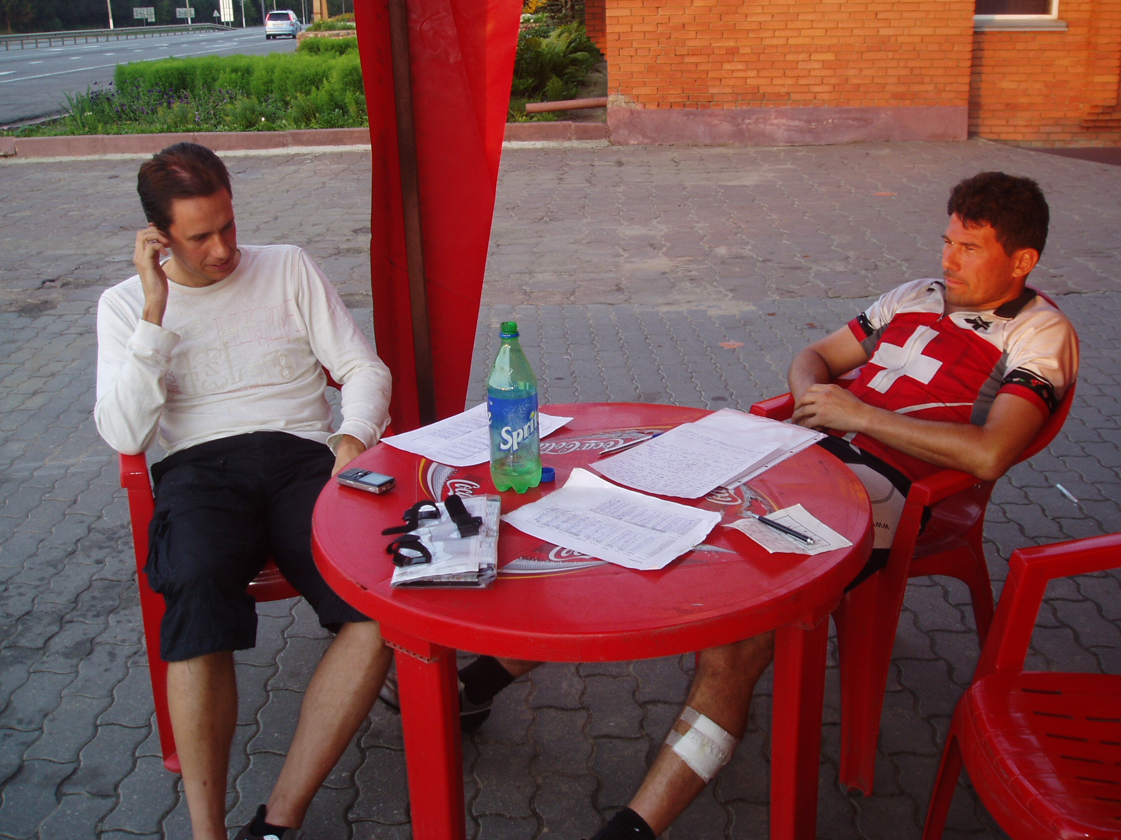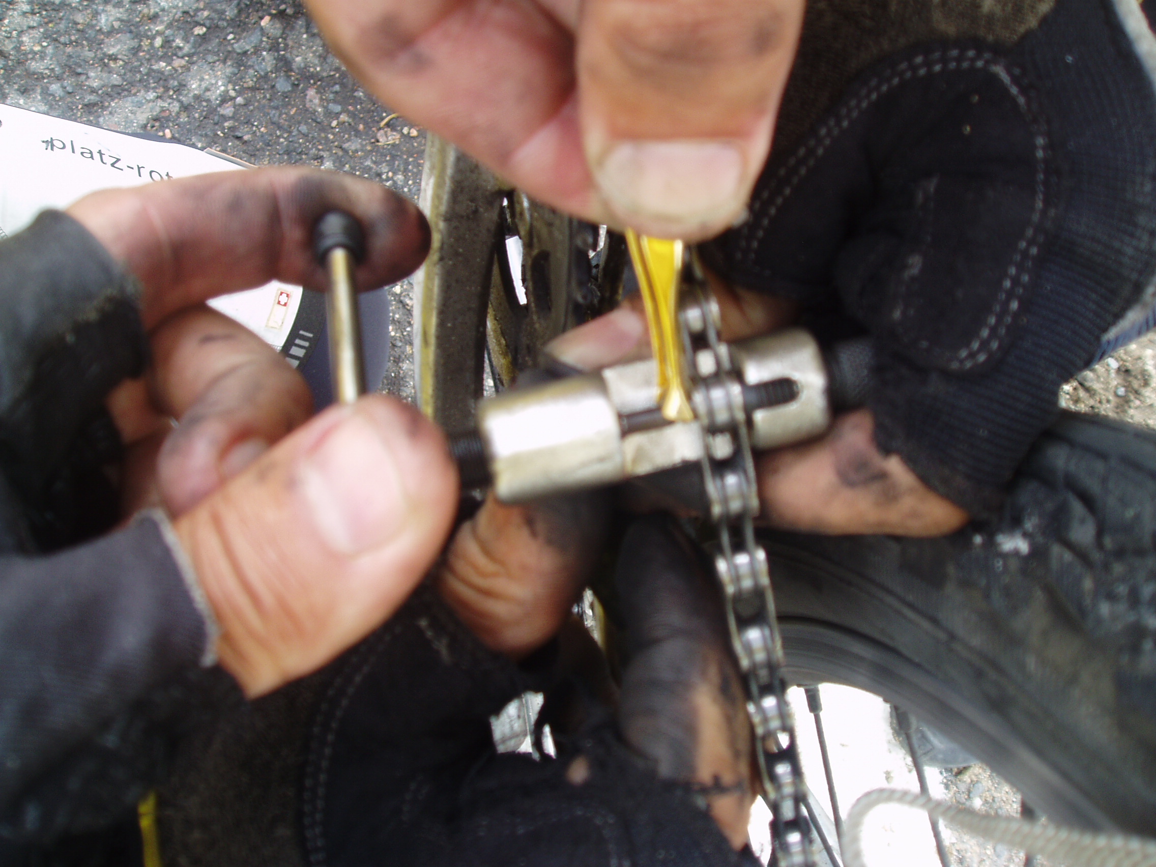 Kaum in Russland angekommen verklemmte sich Beat’s Kette derart fest, dass er nicht mehr weiterfahren konnte. Nach kurzer Besprechung innerhalb des Mechanikerteams fassten wir den Entschluss die Kette zu trennen um sie aus der Verklemmung zu loesen. Dabei leistete uns das mitgefuehrte Kettentool und wiederum Marco Savardi’s „Velomech-Schnellbleiche“ wertvolle Dienste.