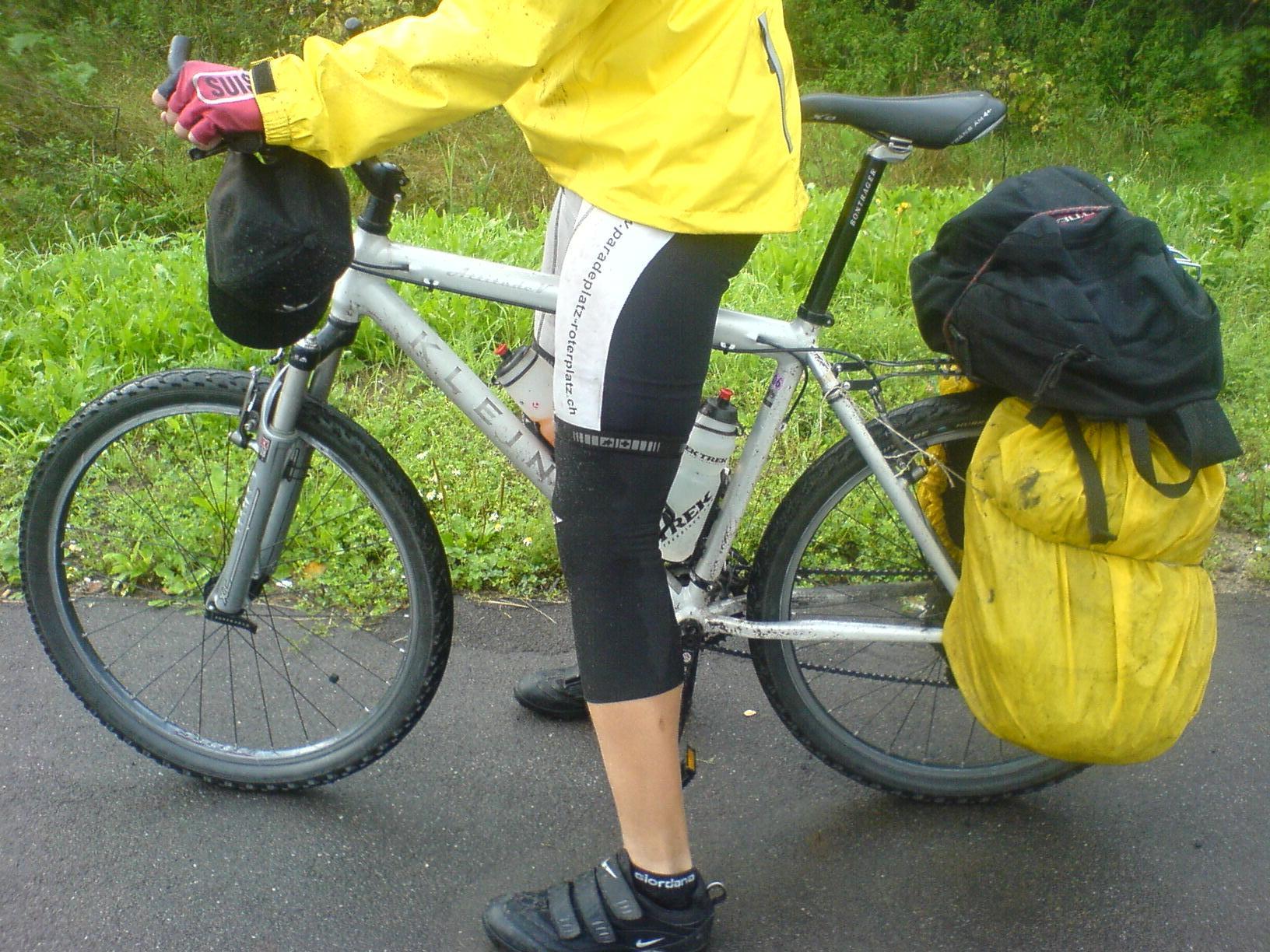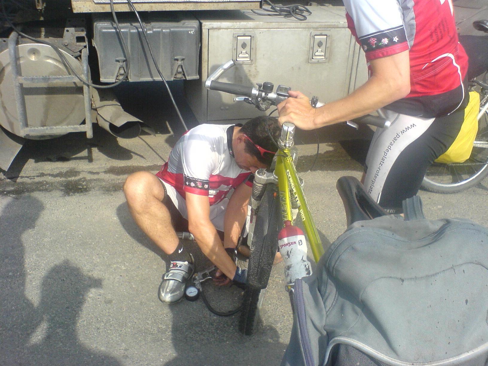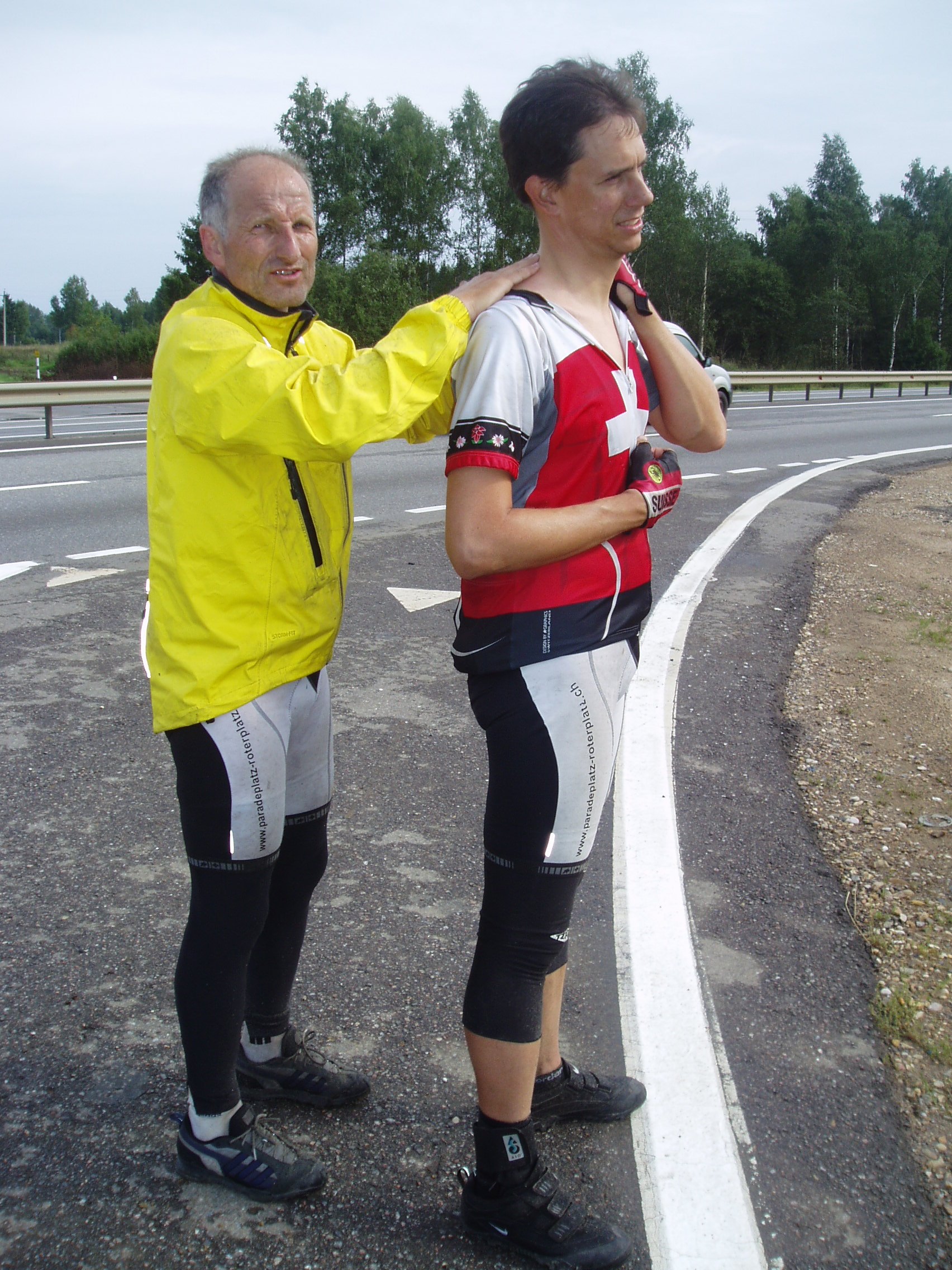 Jetzt sind wir nicht mehr zu stoppen – dachten wir! Doch kaum 20 km später stellte Grazi bei seinem Hinterrad fest, dass die Felge auf ca. 2 cm gerissen war. Für diesen Defekt konnten wir keine Vorkehrung treffen. Das Mechaniker-Team fasste den Entschluss, die Bremsbelege zu entfernen, etwas Reifendruck abzulassen und die defekte Stelle behelfsmässig mit Matt’s Tape, welches er wegen seines Bänderrisses mitführt, zu verstärken. Es bleibt nur zu hoffen, dass das Rad bis Moskau hält!