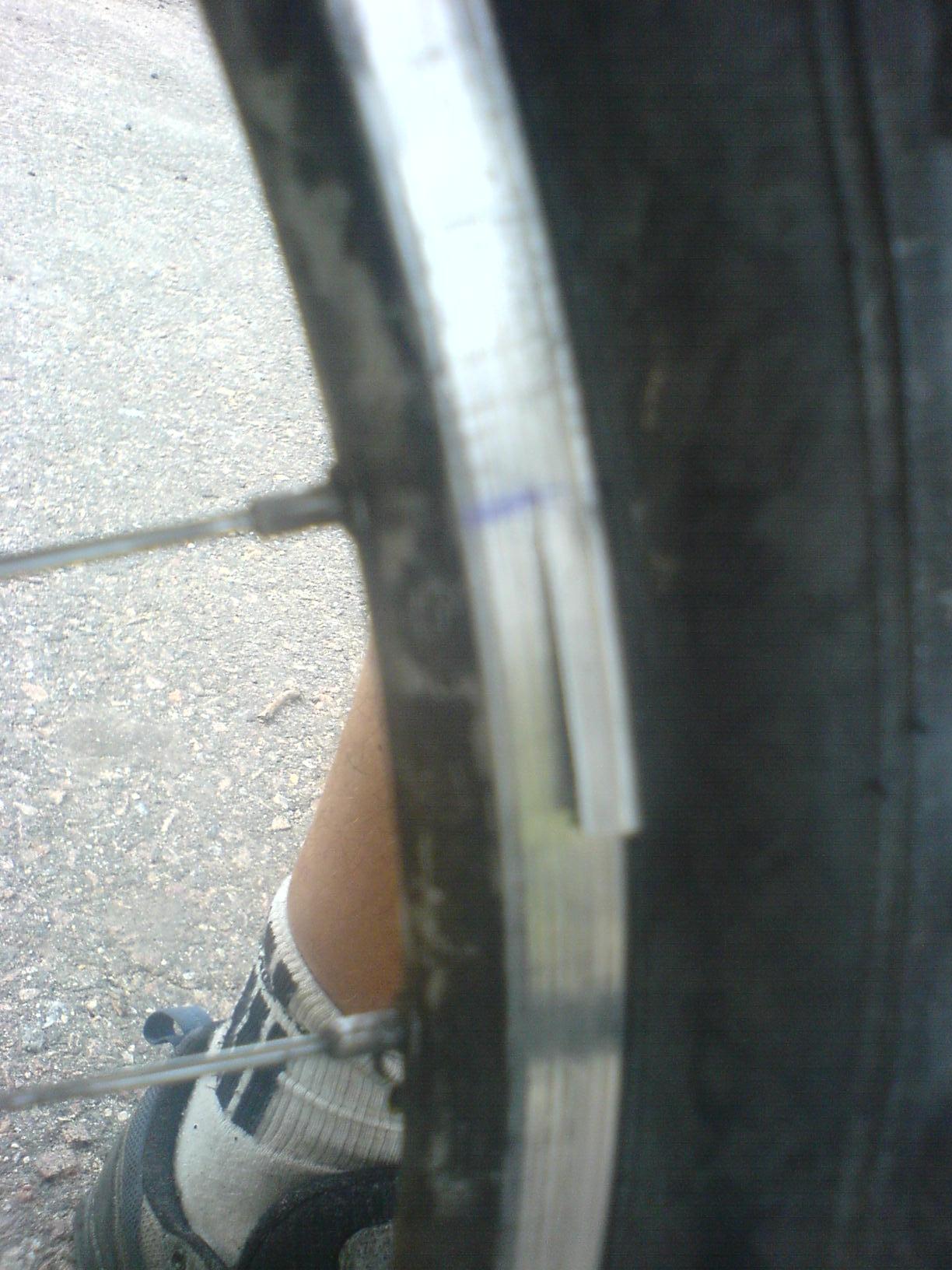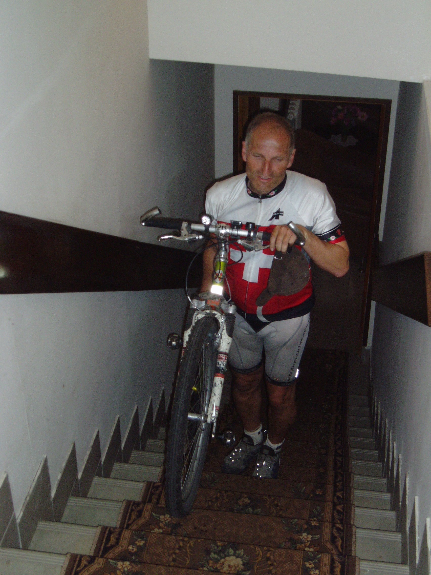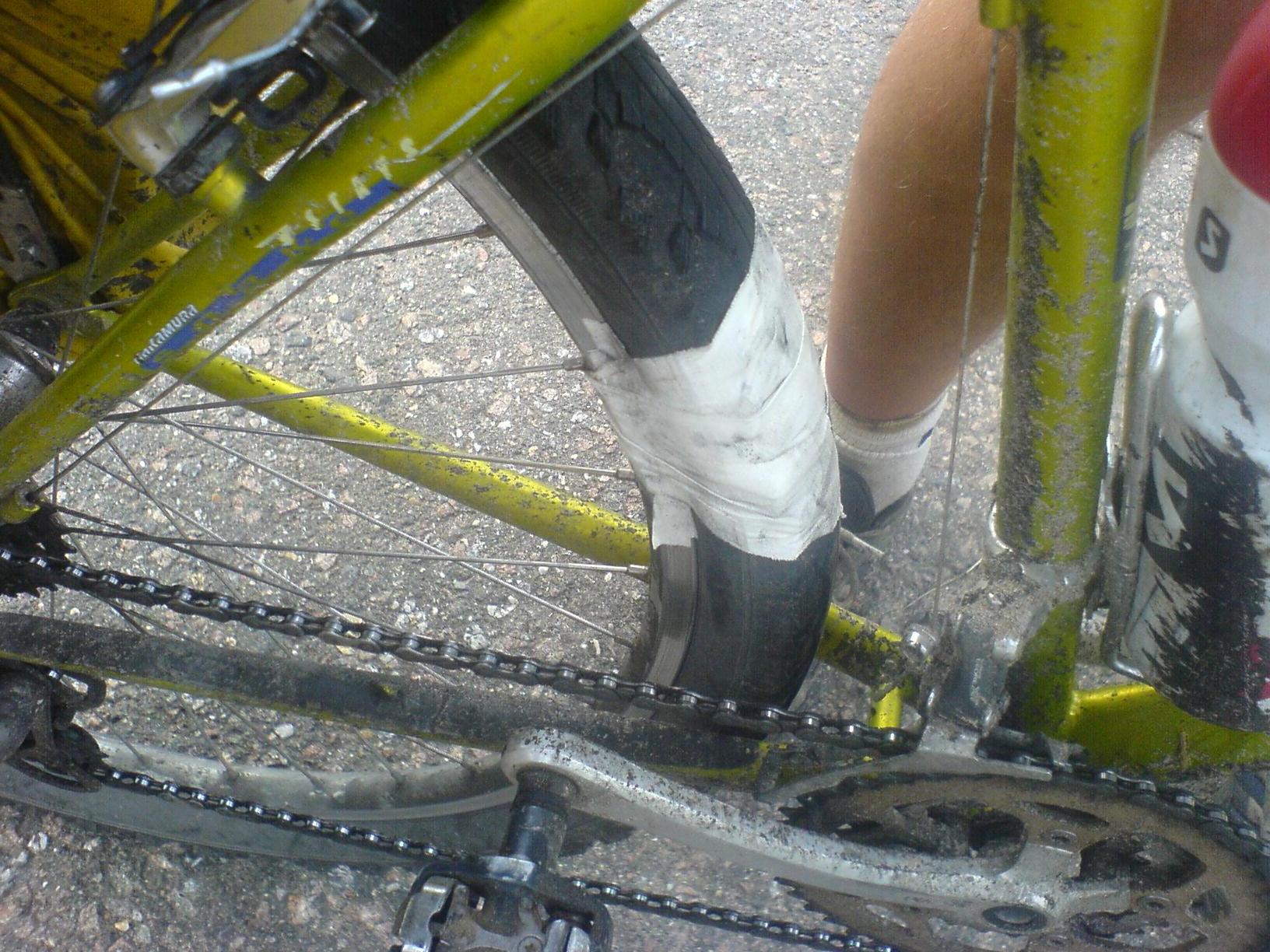 Jetzt sind wir nicht mehr zu stoppen – dachten wir! Doch kaum 20 km später stellte Grazi bei seinem Hinterrad fest, dass die Felge auf ca. 2 cm gerissen war. Für diesen Defekt konnten wir keine Vorkehrung treffen. Das Mechaniker-Team fasste den Entschluss, die Bremsbelege zu entfernen, etwas Reifendruck abzulassen und die defekte Stelle behelfsmässig mit Matt’s Tape, welches er wegen seines Bänderrisses mitführt, zu verstärken. Es bleibt nur zu hoffen, dass das Rad bis Moskau hält!