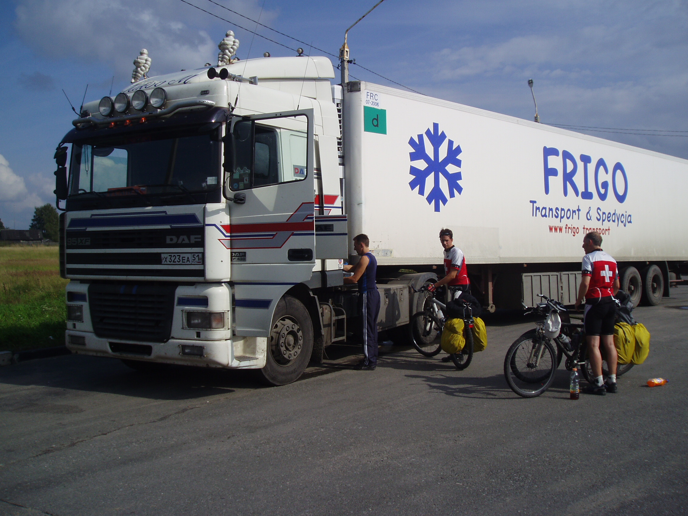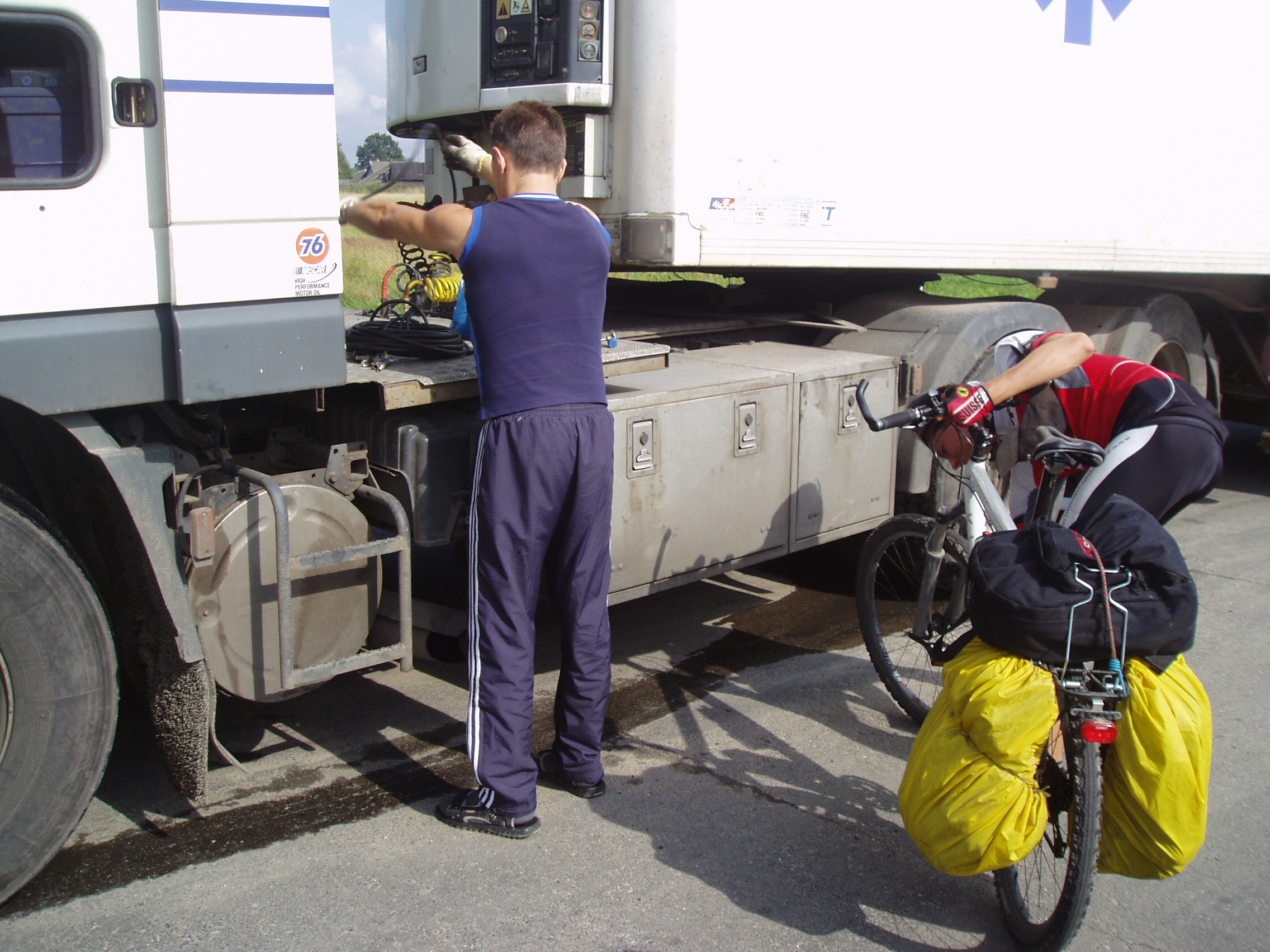 Seit 450 km fuhren wir nicht mehr mit optimalem Reifendruck, welcher mit der Handpumpe nicht erreicht werden kann. Wir passierten seit Minsk unzählige Tankstellen doch bei keiner war „Luft“ zu kriegen. Bei einem weiteren Marschhalt kam Matt mit einem Lastwagenchauffeur ins Gespräch und erklärte ihm die Situation. Worauf dieser, Sascha aus Murmansk, uns seinen Bordkompressor zur Verfügung stellte.